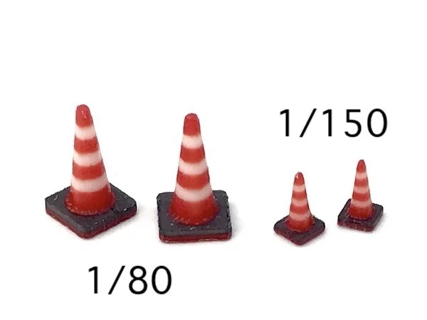 街中の至る所で見かけるパイロンを1/150で製作しています。 フルカラー3Dプリントで彩色済のためそのまま置くだけでディテールアップが可能です。 1/150は高さ約4.6mmと非常に小さくなっております。 レイアウト等への設置の際には両面テープやゴム系接着材をご利用下さい。 ※商品パッケージは一部異なる場合がございます。 | 使用方法 |