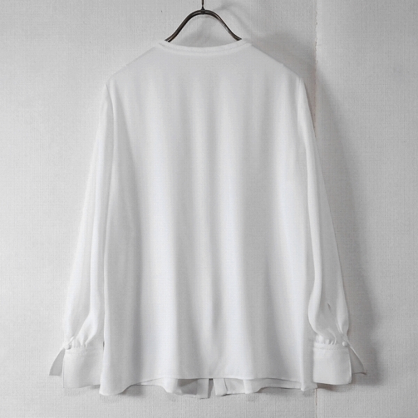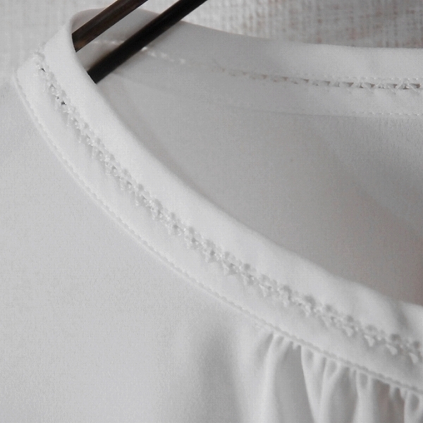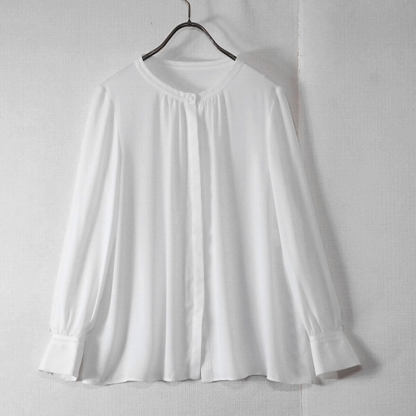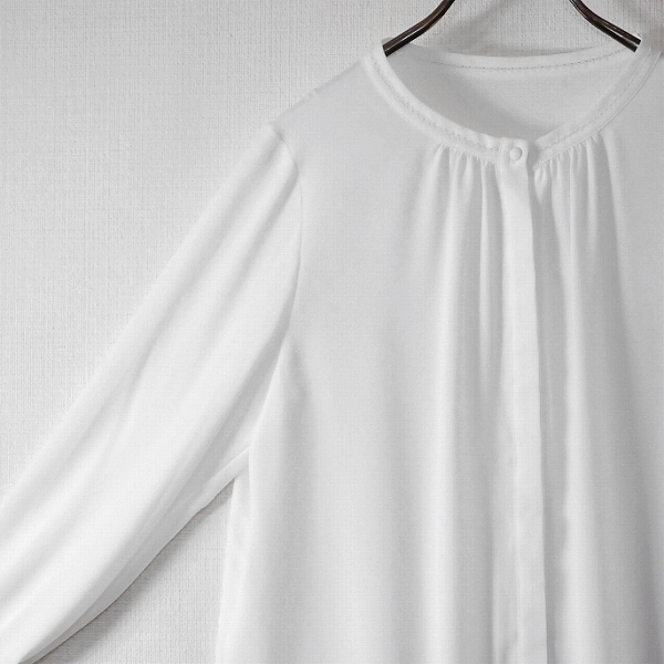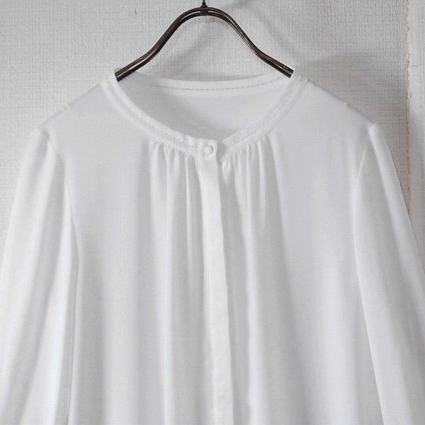首まわりに細かなギャザーと飾りステッチを配し、正面はすっきり見える比翼仕立て。