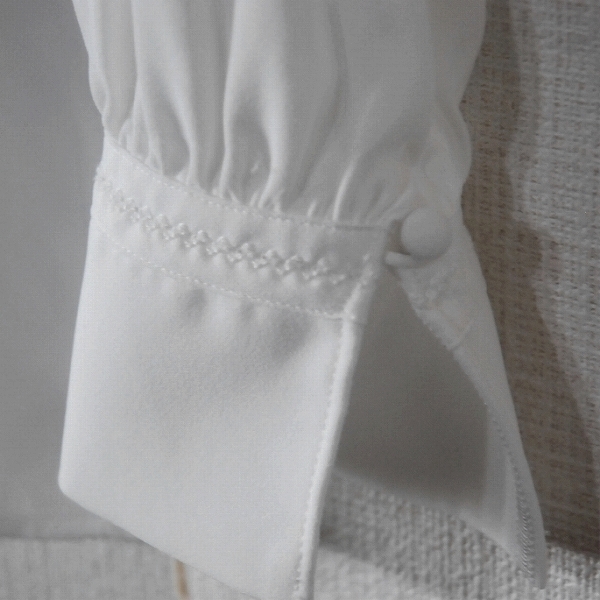 袖口は開きのあるカフスに共布ボタンの上品なデザイン。