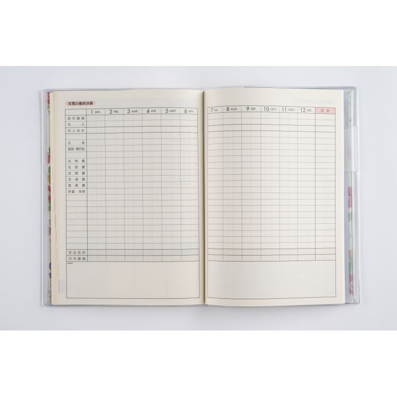 【本文付録】年間決算表、医療費控え、公共料金控え、贈答の控え、クレジット控え、くらしのコラム、料理コラム、マイハウス・マイカーメモ、貯蓄・保険控え