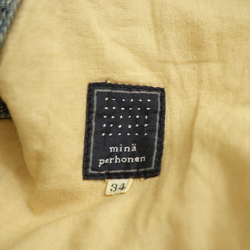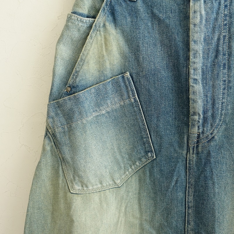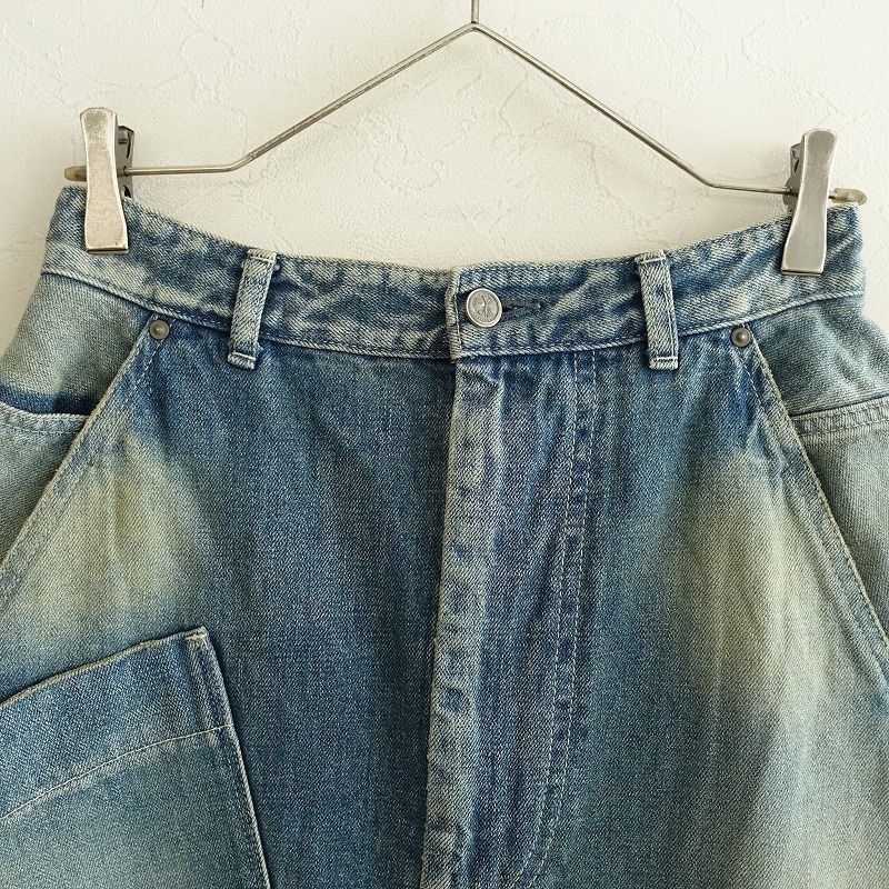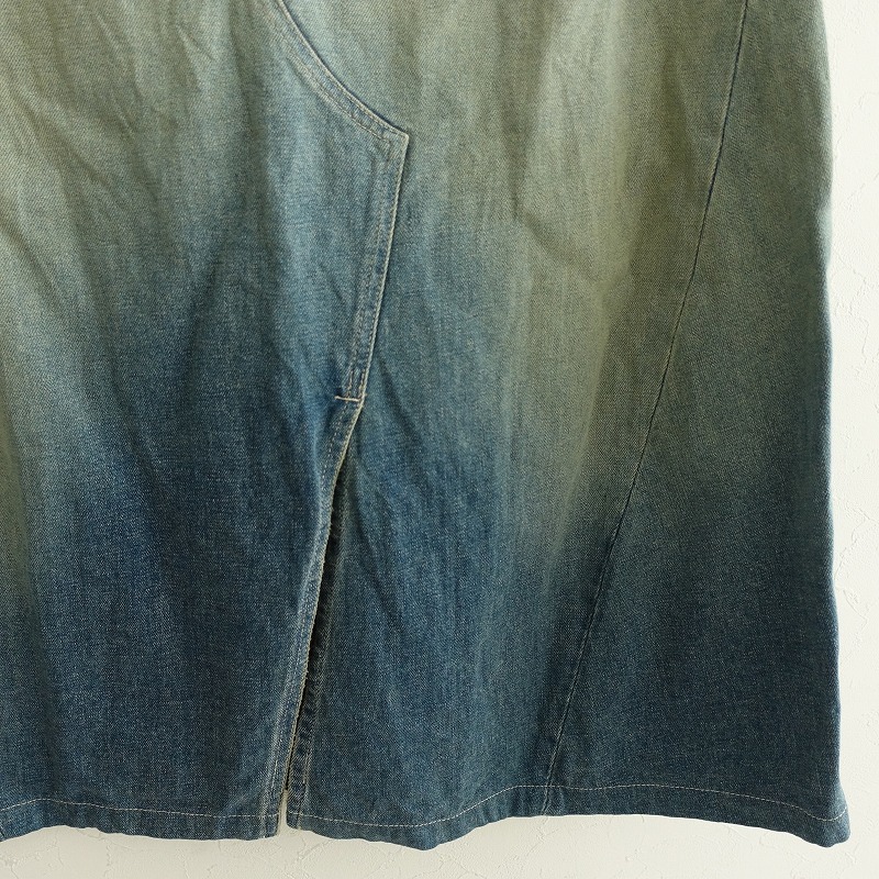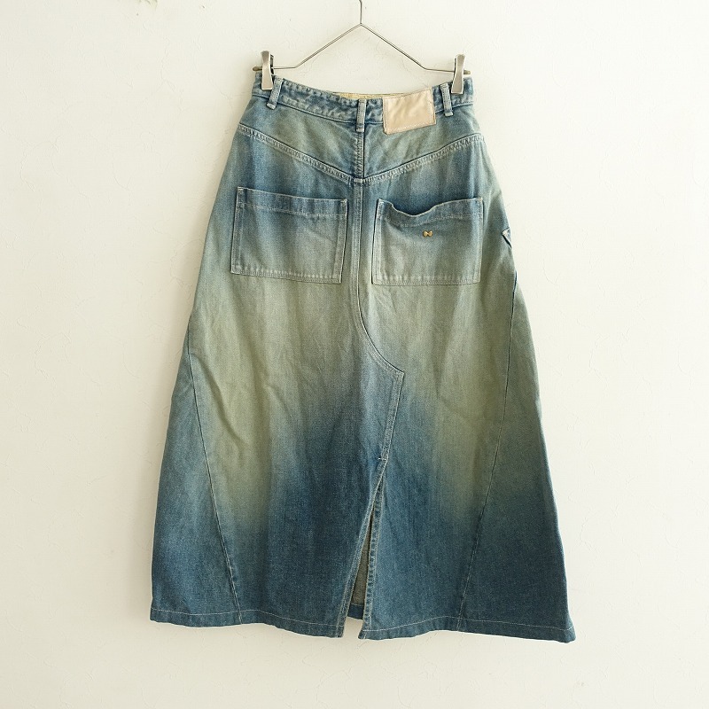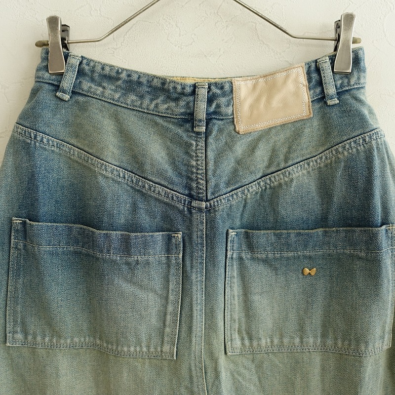 | mina perhonenのalways デニムスカートです。カラーはインディゴブルーのデニム素材で、ユーズド加工やダメージ加工が施されております。フロントボタン&ジッパー開閉式で、ウエスト&ヒップの計6か所にポケットがあり、右ヒップポケットにポイントチャームとバック右腰にレザーパッチがあしらわれております。裾はバックセンターに約31㎝のスリットがあり、バックの方がやや丈が長くなっております。ウエスト裏地とポケット袋布の一部に「mermaid」のテキスタイル刺しゅうが施されております。定価(メーカー希望小売価格)48400円の商品です。 |