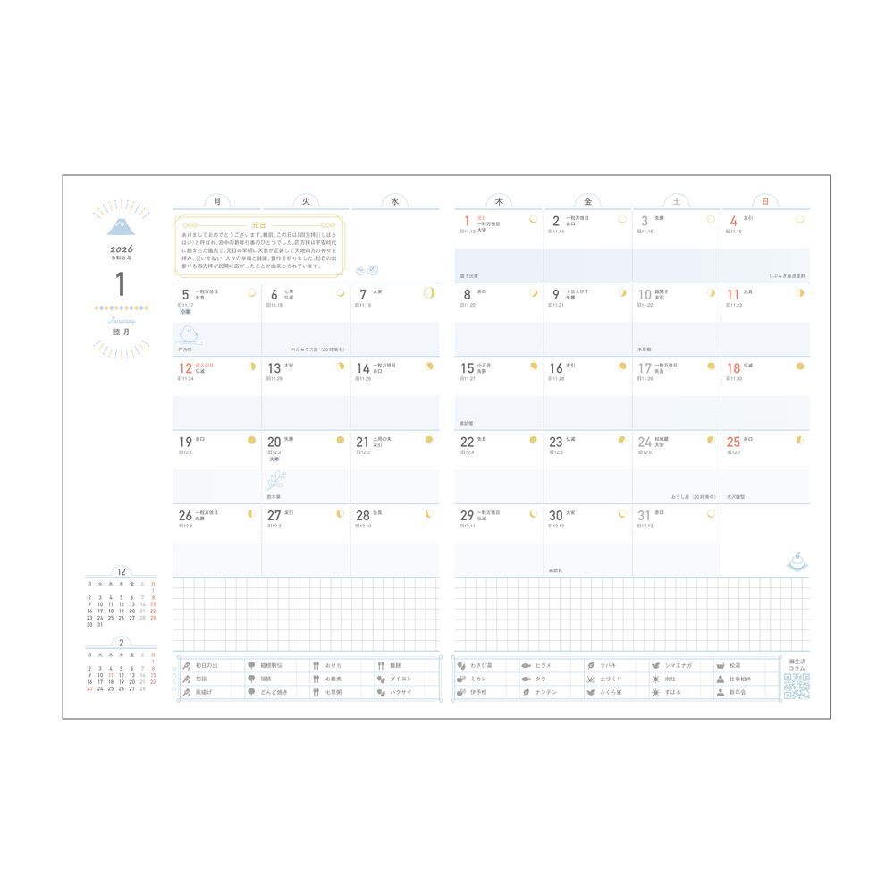 付録:年間計画表、二十四節気・七十二候解説、四季の計画表、旬の食材レシピ、月の呼び名・四季の星紹介、季語紹介、満年齢早見表