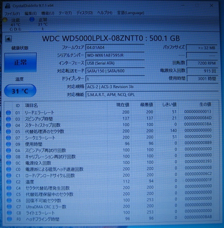 また、電源投入回数 915回、使用時間 3001時間と使用頻度も少ない方かと思います。