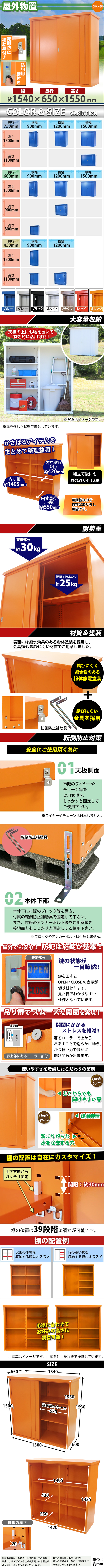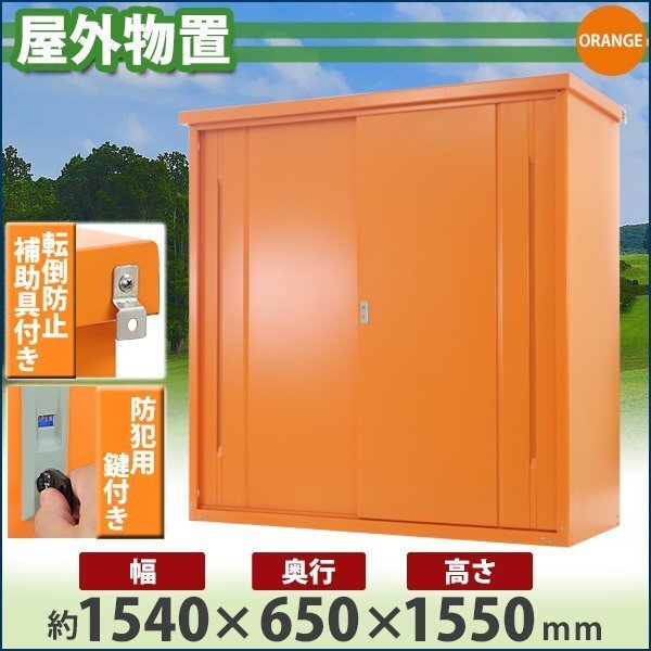 | 商品名 | 送料無料 屋外物置 スチール製 家庭用収納庫 鍵付き オレンジ 幅約1540mm×奥行約650mm×高さ約1550mm 倉庫 納屋 物置き スチール物置 スチール収納庫 ガレージ 収納 可動棚 吊り戸 吊戸 吊り扉 上吊り 吊引き戸 庭 ガーデン monookishw15d60h15or |