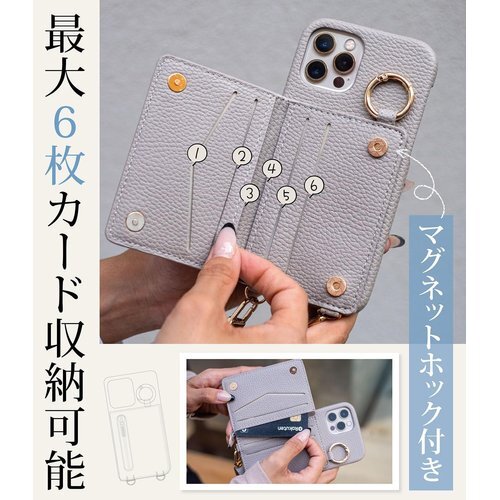 【商品特徴】■ショルダーストラップ付き ■マグネットホック ■カード収納6箇所があり ■スピーカー/充電ホール付き ■スタンド機能付き ■リング付き