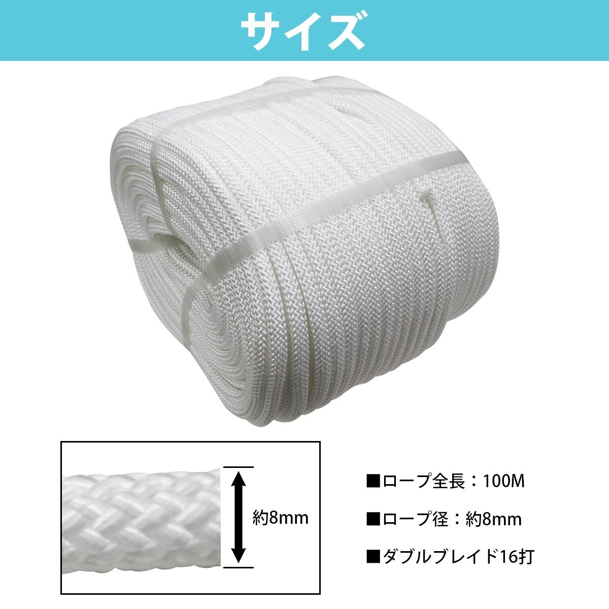 16打 8mm 100m 係留ロープ フェンダーロープ ダブルブレイド 白/ホワイト マリン ロープ 船 係船 ロール 8ミリ アイ加工無