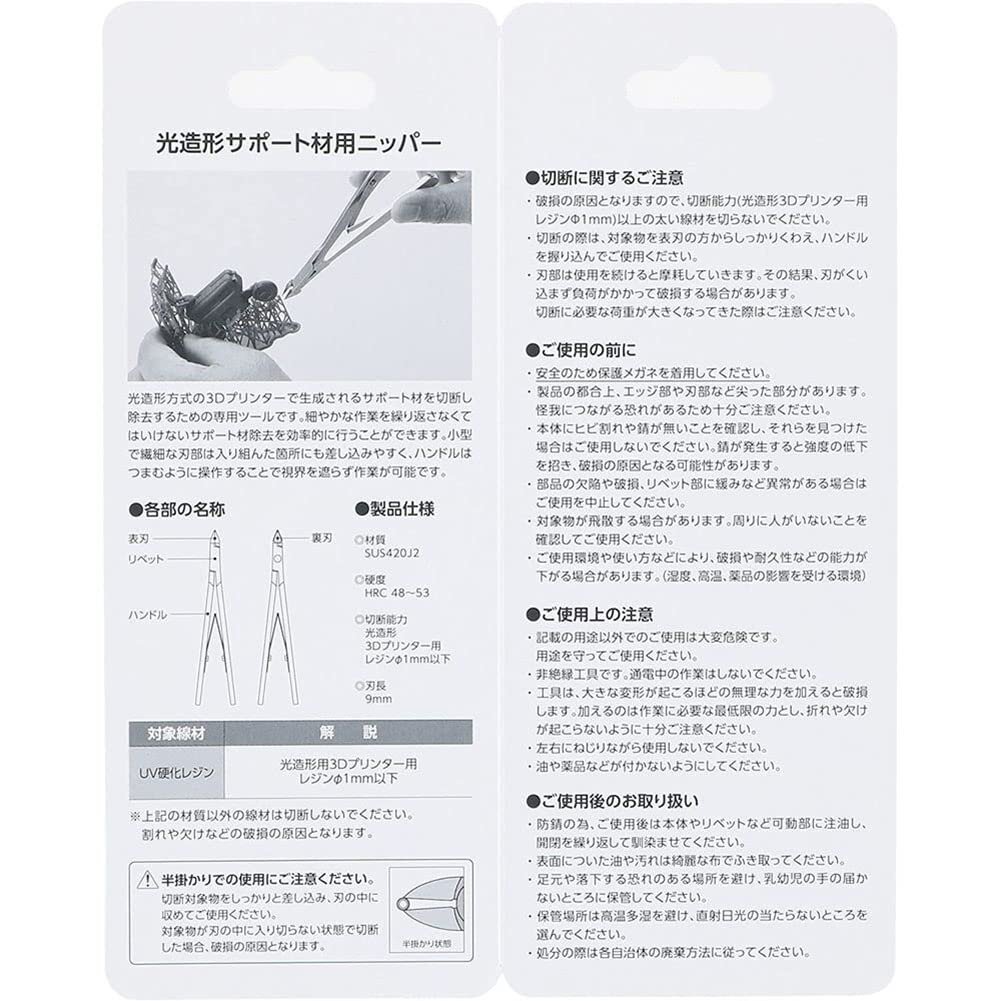 ブランド:MarutoHasegawakosakujo光造形方式の3Dプリンターで生成されるサポート材除去作業用の専門工具光造形方式の3Dプリンターで生成されるサポート材を切断し除去するための専用ツールです。細やかな作業を繰り返さなくてはいけないサポート材除去を効率的に行うことが出来ます。小型で繊細な刃部は入り込んだ箇所に差し込みやすい。ハンドルはつまみながら持つことで視界を遮らず作業が可能。柄部に、平面を設け、研磨を施したことで指が密着し持ちやすい。作業性の良いバネ付。グッドデザイン賞受賞日本製用途:光造形方式3Dプリンターで生成されるサポート材の切断・除去
