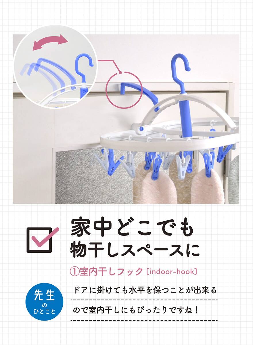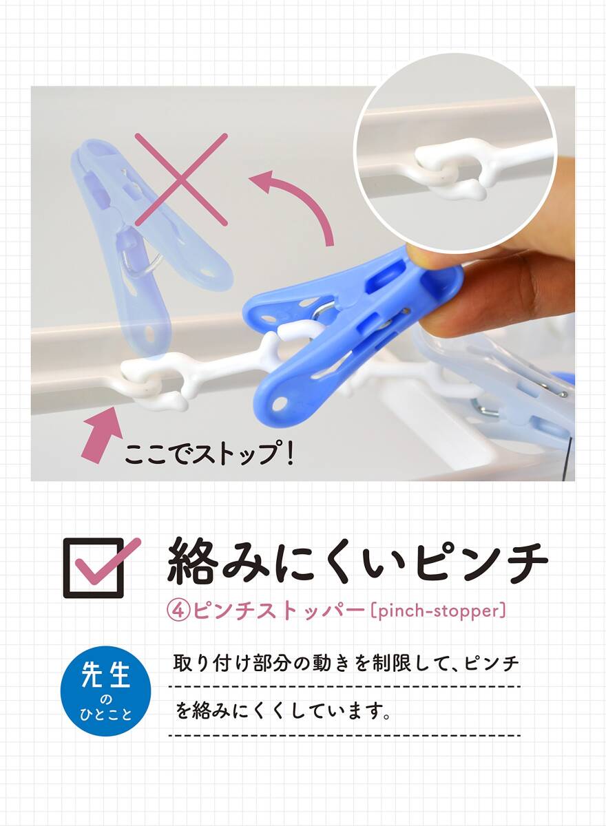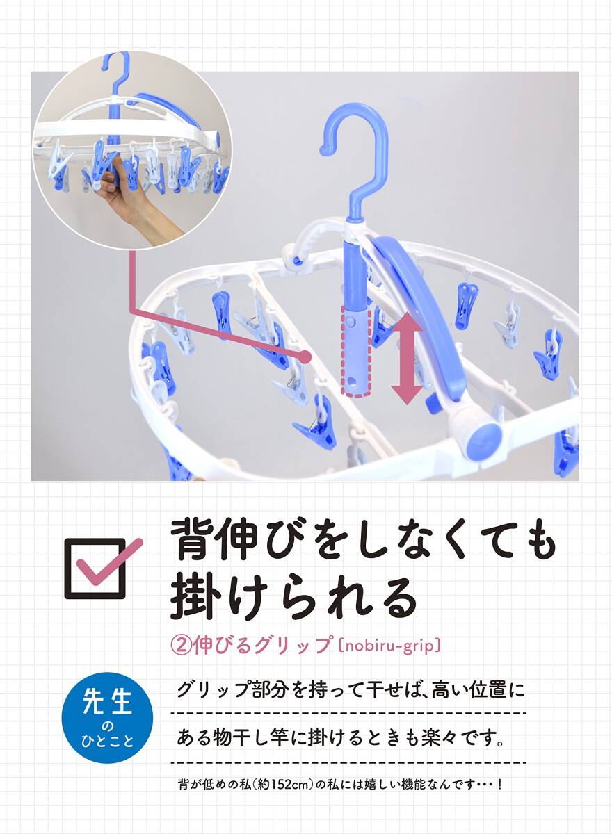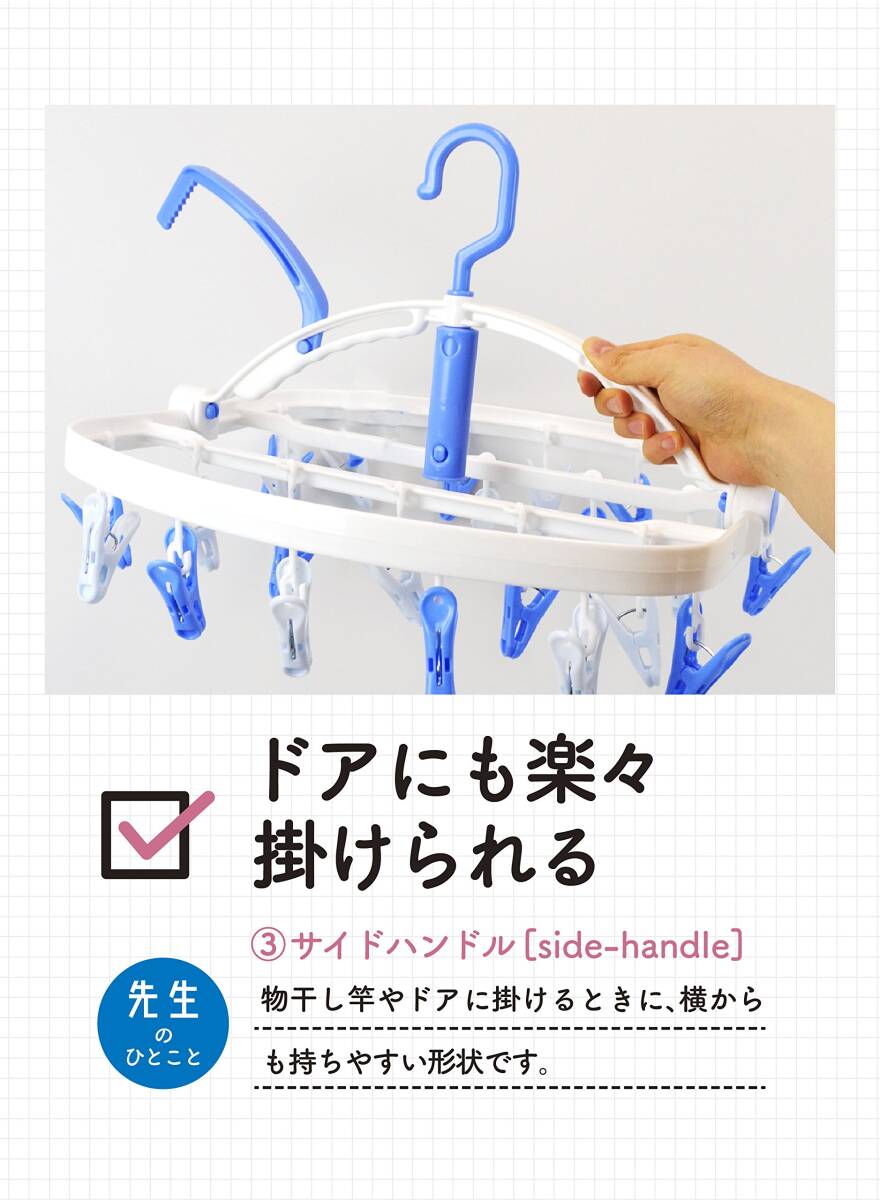 説明 ●室内干しもできる下着や小物にちょうど良いハンガー ●室内干しフック・・・ドアに掛けても水平を保つことができるので室内干しにもぴったり ●持ちやすいハンドル・・・物干し竿やドアに掛ける際に、横からも持ちやすい形状 ●伸びるグリップ・・・グリップ部分を伸ばせるので、高い位置にある物干し竿に掛けるときもラクラク ●絡みにくいピンチ・・・取り付け部分の動きを制限してるからピンチが絡みにくい