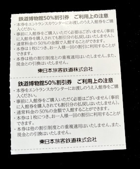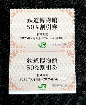 JR東日本 株主サービス券 鉄道博物館割引券(50%)2枚  期限:2026年6月30日