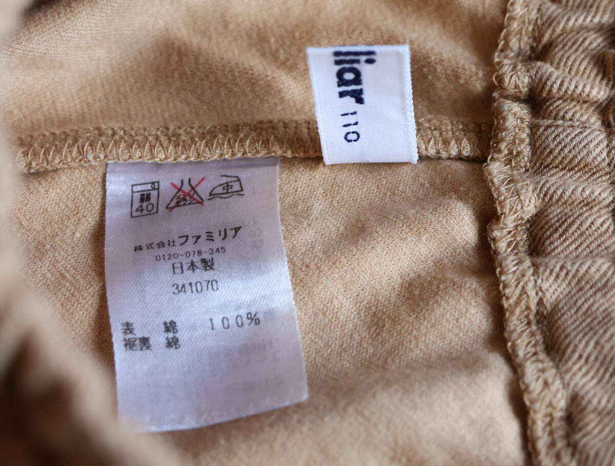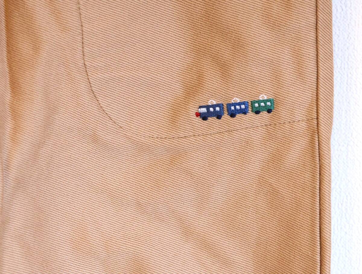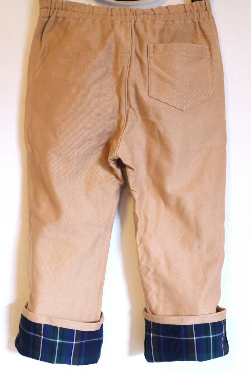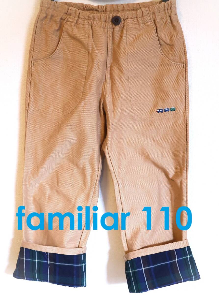 ■ファミリアの110cmサイズのパンツ(ベージュ色)です。折り返すとチェック柄が見え、おしゃれに履いていただけます。丈が短くなってきても、折り返しなしで、長く使えます。電車の刺繍あり。若干の色褪せはありますが、お出掛け用に履かせていたため、使用頻度は低かったです。綿100%。