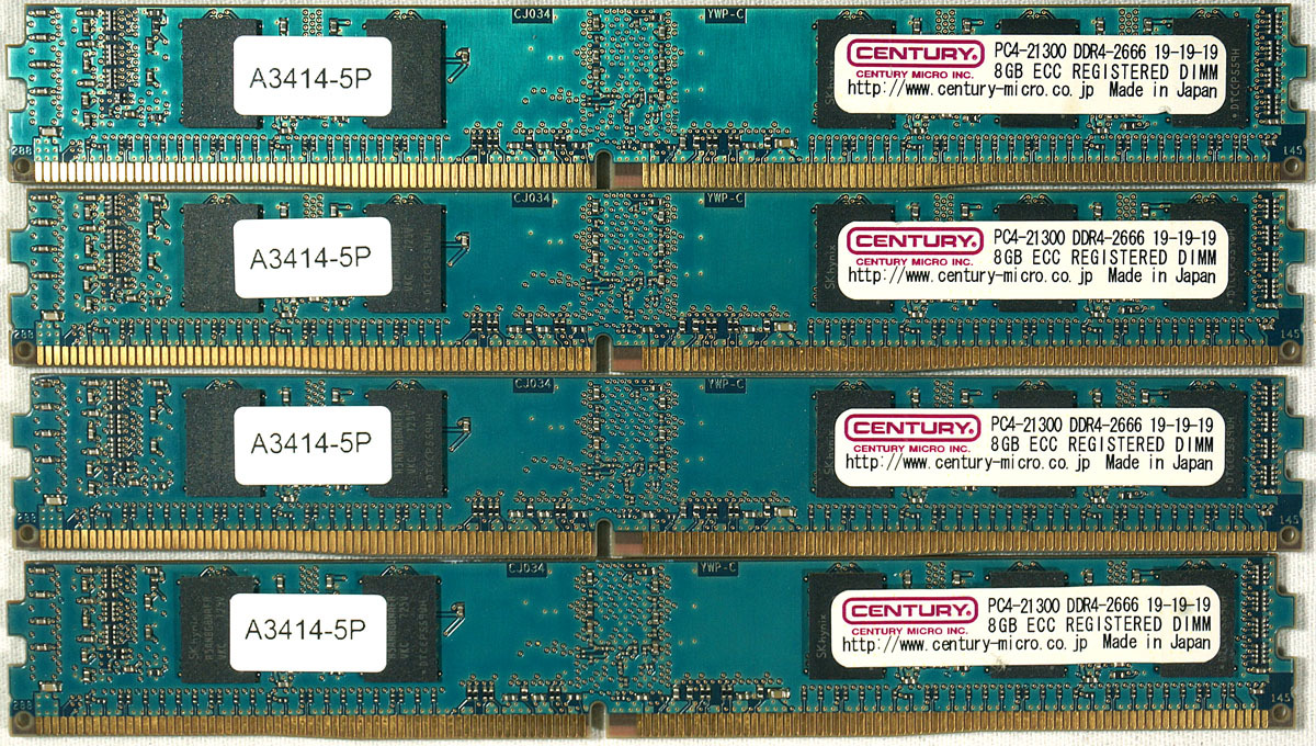 | ご覧いただきありがとうございます。 Century Micro製 サーバー、ワークステーション用メモリ DDR4 8GB ECC Registered DIMM です。 PC4-21300 DDR4-2666 19-19-19 8GB ECC REGISTERED DIMM だいたい同じ状態のものが複数ありますので 写真は同型番の一例です。 DELL のワークステーション Precision Tower 5810 、5820 HP のワークステーション Z440 実機でテストし、問題ありませんでした。 テストは同型番8枚で行いました。 メモリ型番的には Registeredメモリ採用のHP Proliant Gen9、Gen10 サーバーや Z440 Z640 Z840 Dell Precision T5820 T5810 T7810 Lenovo ThinkStation P500 P700 P900 などのワークステーションや 自作向けのX99とXeonの組み合わせでも使えると思いますが、 入札前にご自分のパソコンで使用できるかよくご確認ください。 ロープロファイルタイプなので、通常のメモリよりも背が低く 1Uタイプのラックマウントサーバーや mini-itxマザーなど、CPUクーラーと干渉するような環境に最適です。 ロープロファイルメモリは大変レアでなかなか入手困難だと思います! テストしてあるものですので、お客様の環境で動作しない場合でも返品、返金はお断りします。 (落札後ご自分で破損させたものを返品しようとする方、商品のすり替えをする方がいるため、このような対応にさせていただいています。) 一般的な情報として・・・ 交換時、BEEP音で起動しない場合、認識しない場合は 1本ずつ試してください。 挿すスロットを入れ替えてみてください。 スロット側に埃等ついていないか確認してください。 Precision 5820 Towerは特に、メモリにシビアな印象です。 1本ずつ試してみてください。 CMOSクリアが必要な場合もあるようです。 その他お尋ねになりたい点がありましたら、Q&Aからお尋ねください! 複数購入ご希望の方、在庫があるかもしれませんので お問い合わせください! |