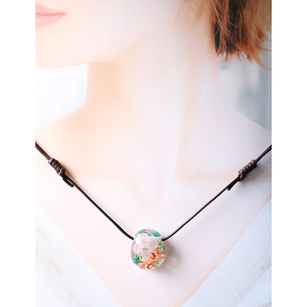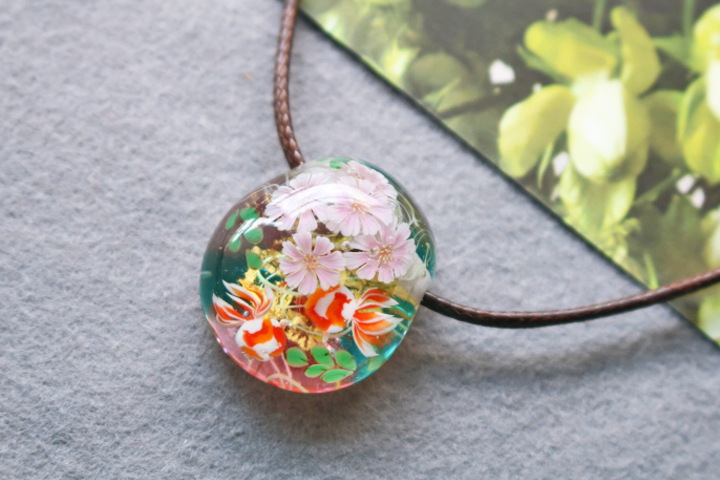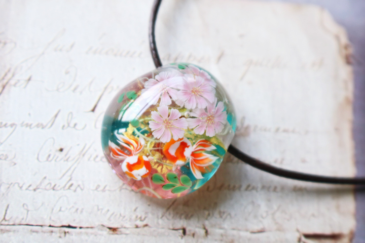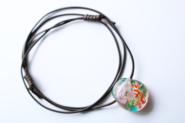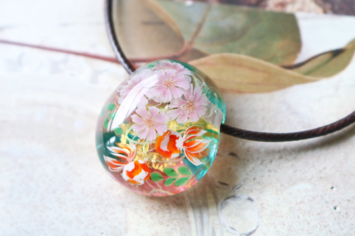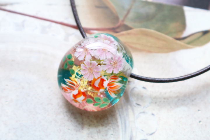 コスモスと金魚のとんぼ玉ガラスペンダント 金箔入り