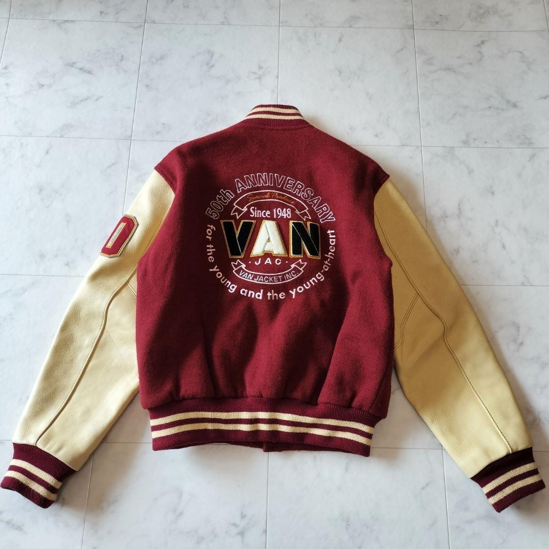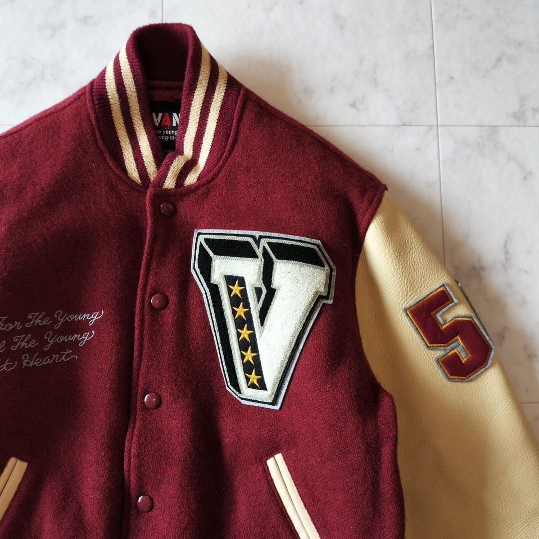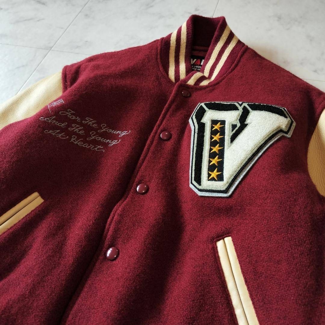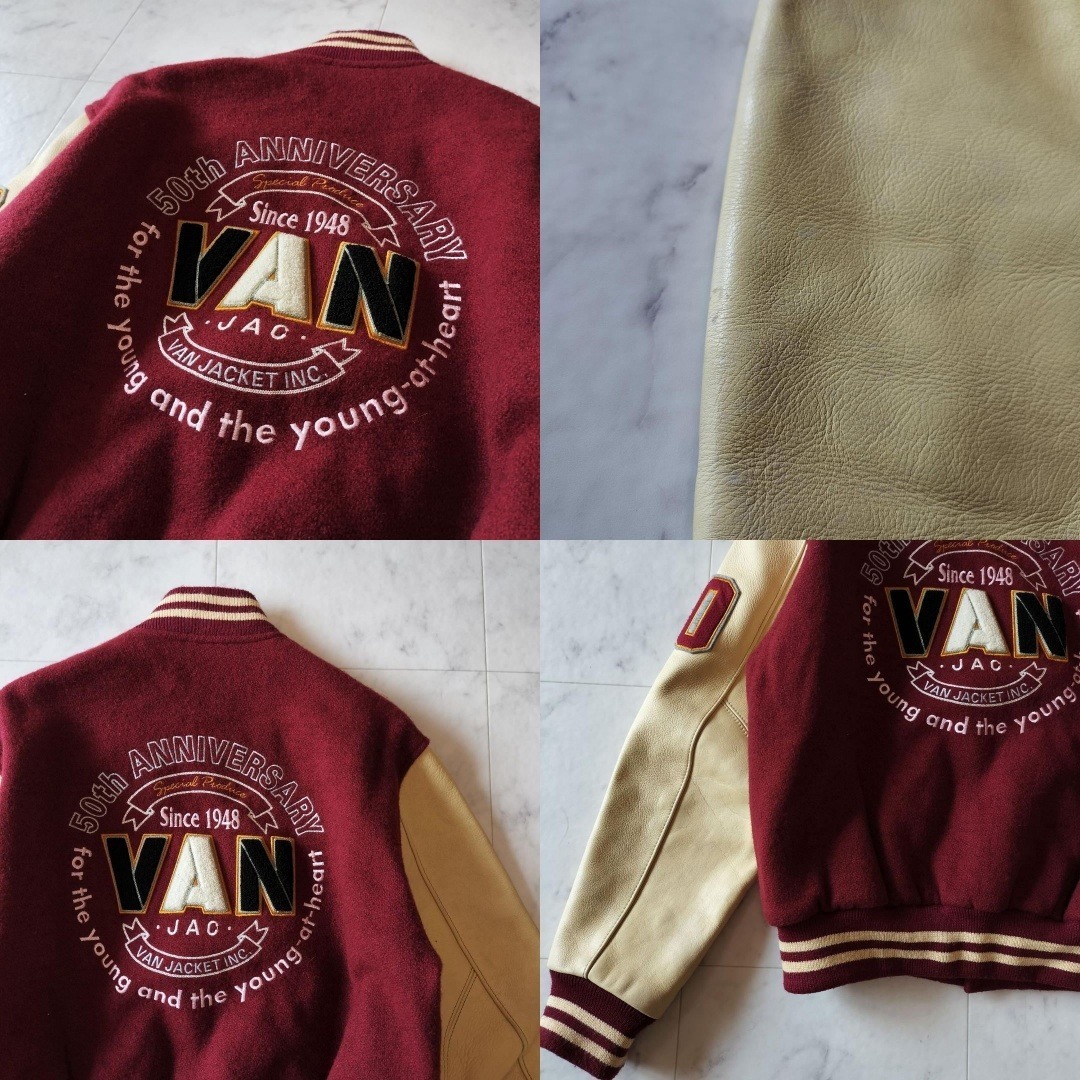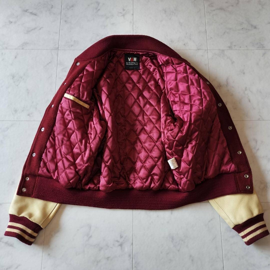 VAN JAC VAN JACKET ヴァンヂャケット ヴァンジャケット 50周年記念 限定モデル 袖レザー スタジャン サイズL メルトン×レザー ボルドー×ベージュ スタジアムジャンパー ワッペン 刺繍 キルティングライナー 日本製 made in Japan 牛革 90年代 ビンテージ レア 希少 バーシティジャケット ヴァーシティジャケット 毛 ウール