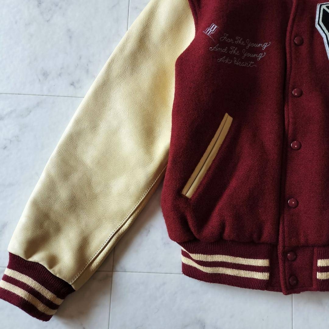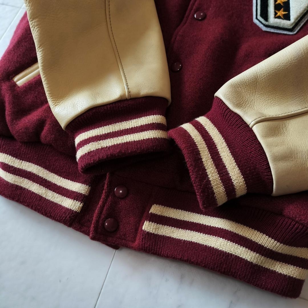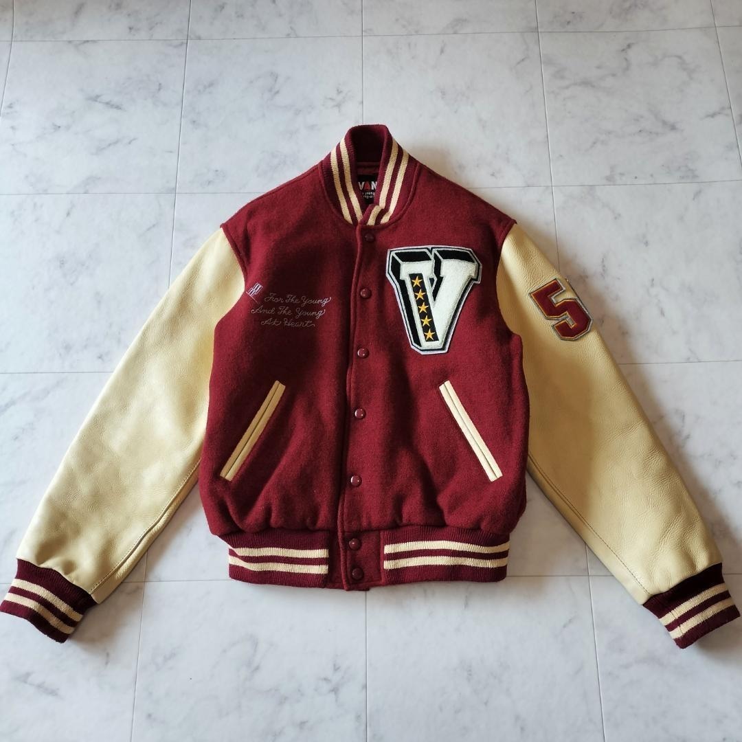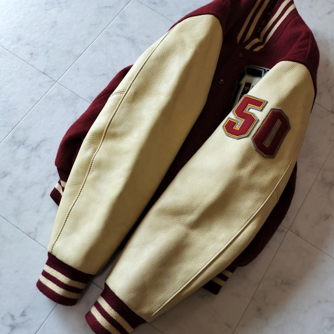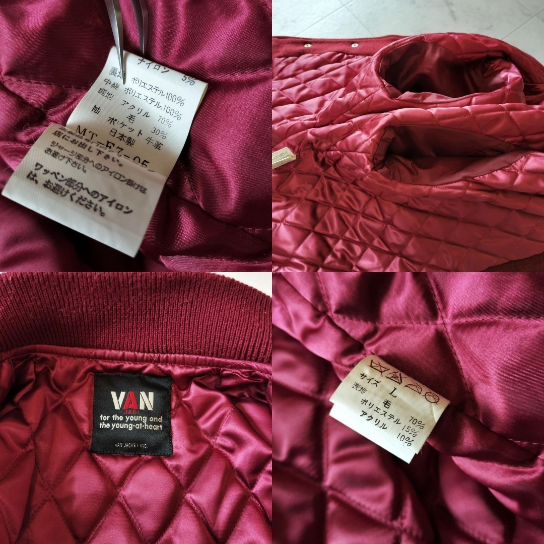 VAN JAC VAN JACKET ヴァンヂャケット ヴァンジャケット 50周年記念 限定モデル 袖レザー スタジャン サイズL メルトン×レザー ボルドー×ベージュ スタジアムジャンパー ワッペン 刺繍 キルティングライナー 日本製 made in Japan 牛革 90年代 ビンテージ レア 希少 バーシティジャケット ヴァーシティジャケット 毛 ウール