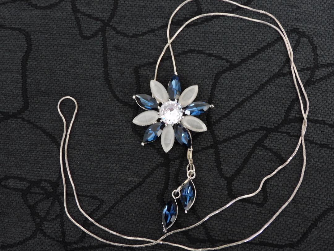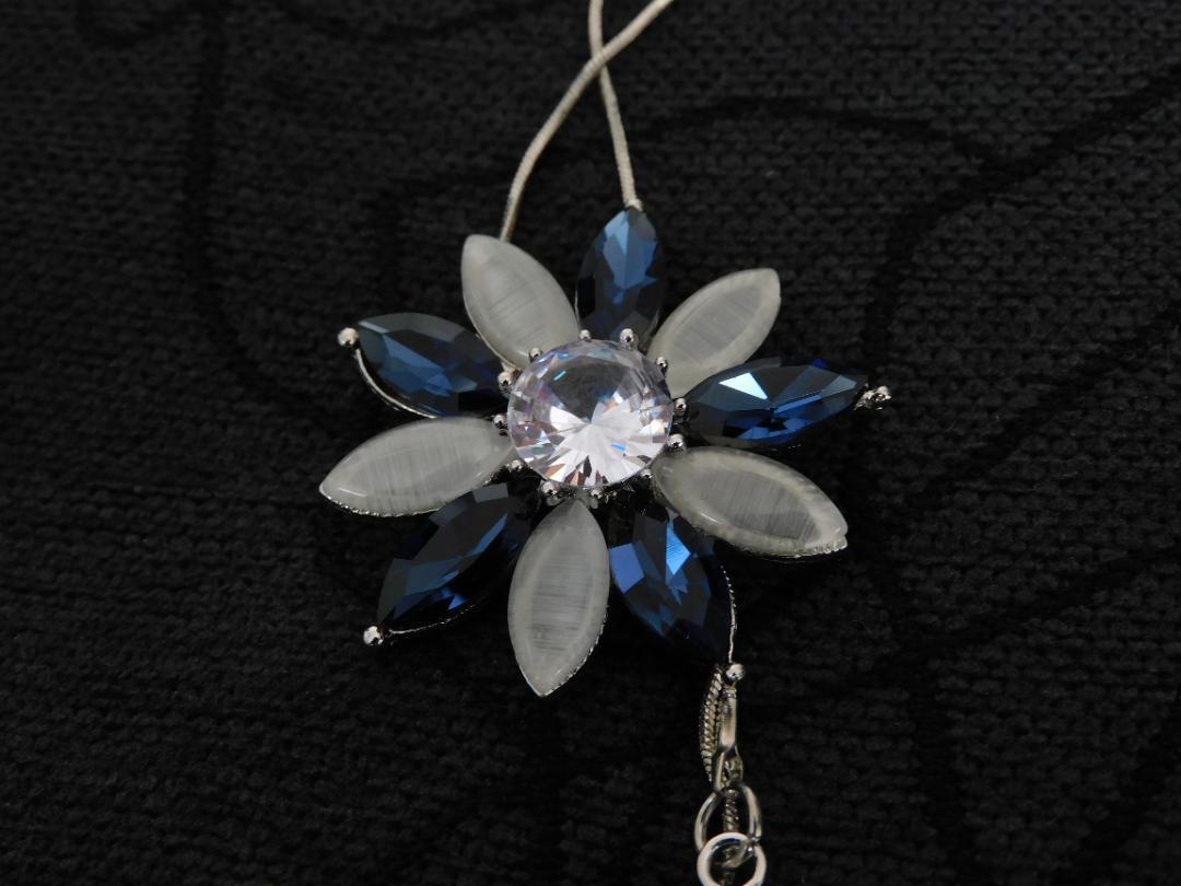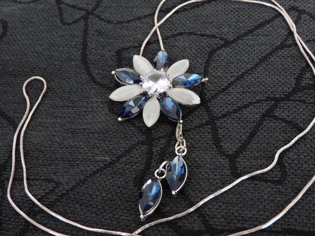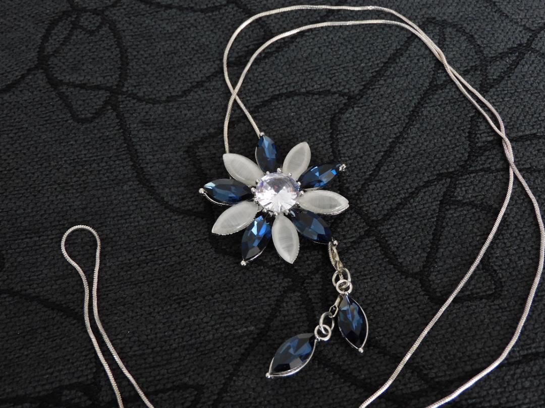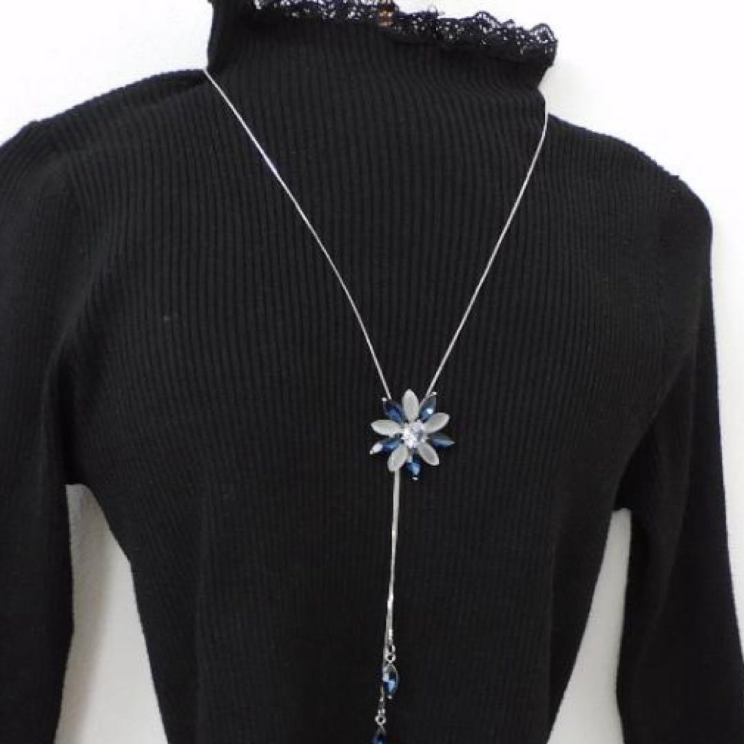 (2606)ブルー×ライトグレー フラワー ロングネックレス 自由に長さ調整