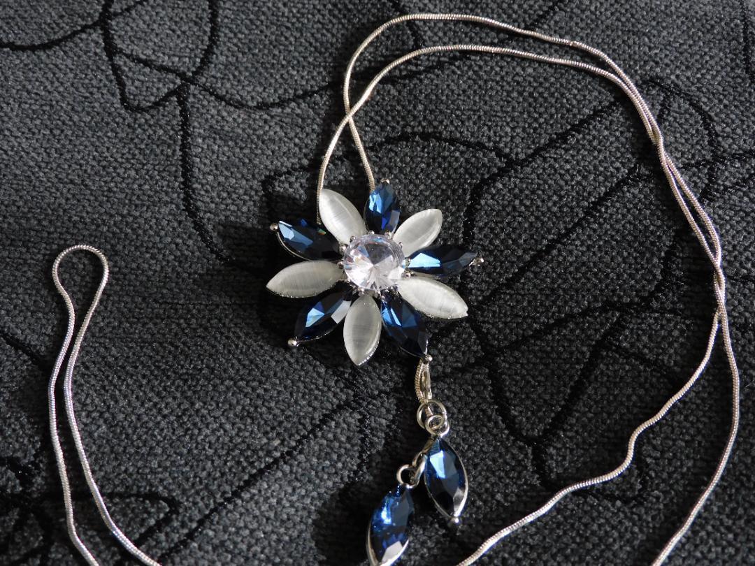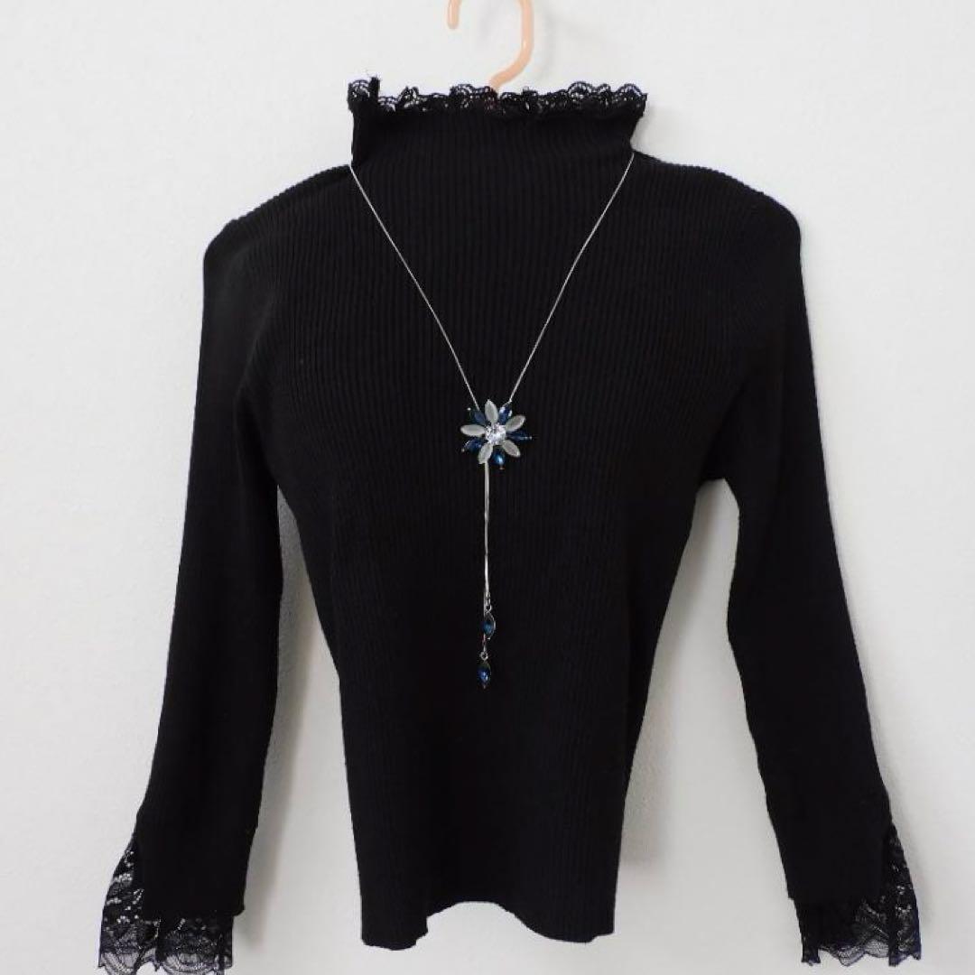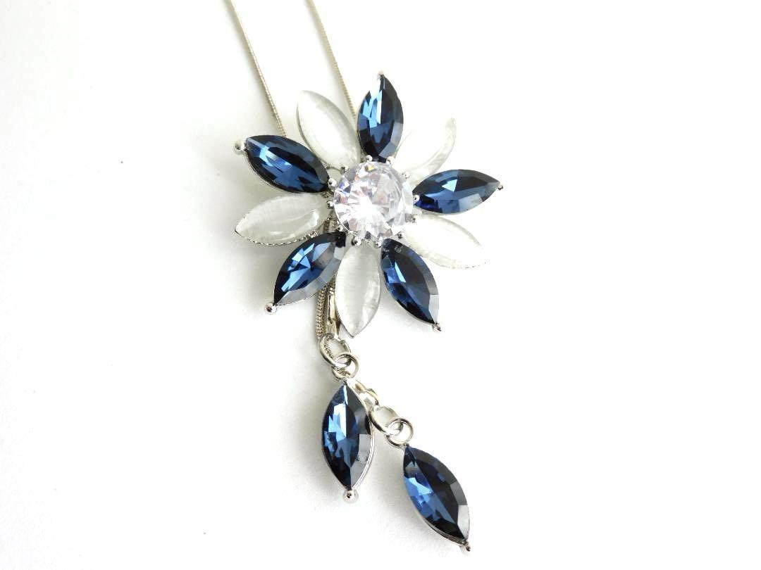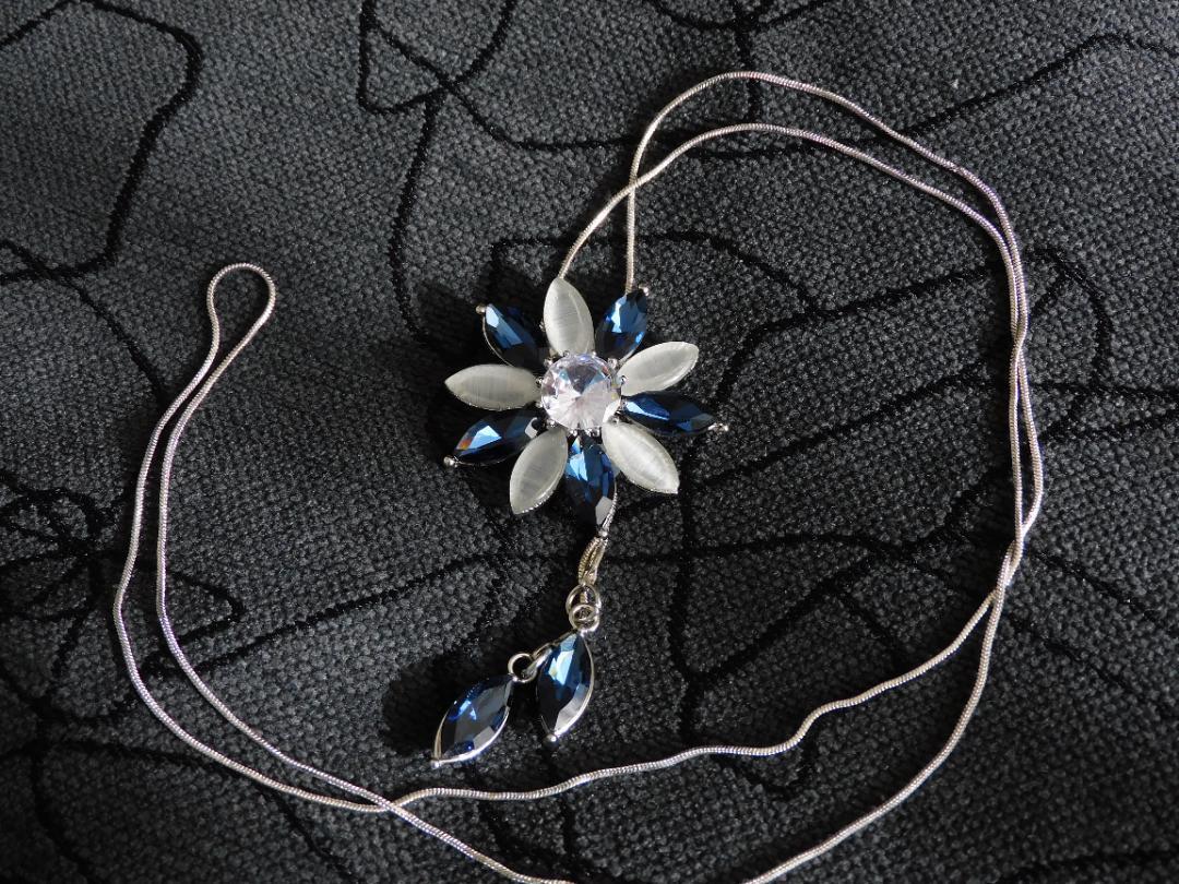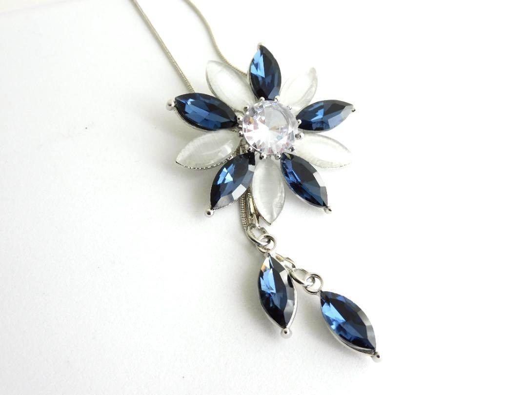 (2606)ブルー×ライトグレー フラワー ロングネックレス 自由に長さ調整