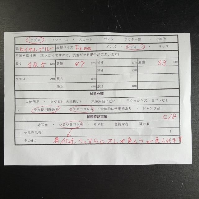 ・シミやヨゴレ有(肩付近うっすらとスレや色ムラが見られます)