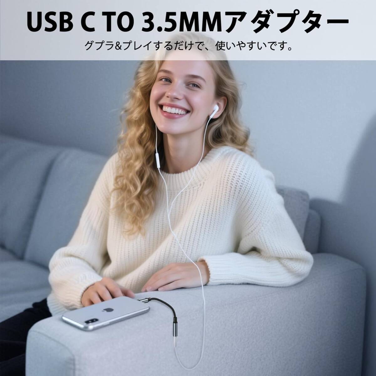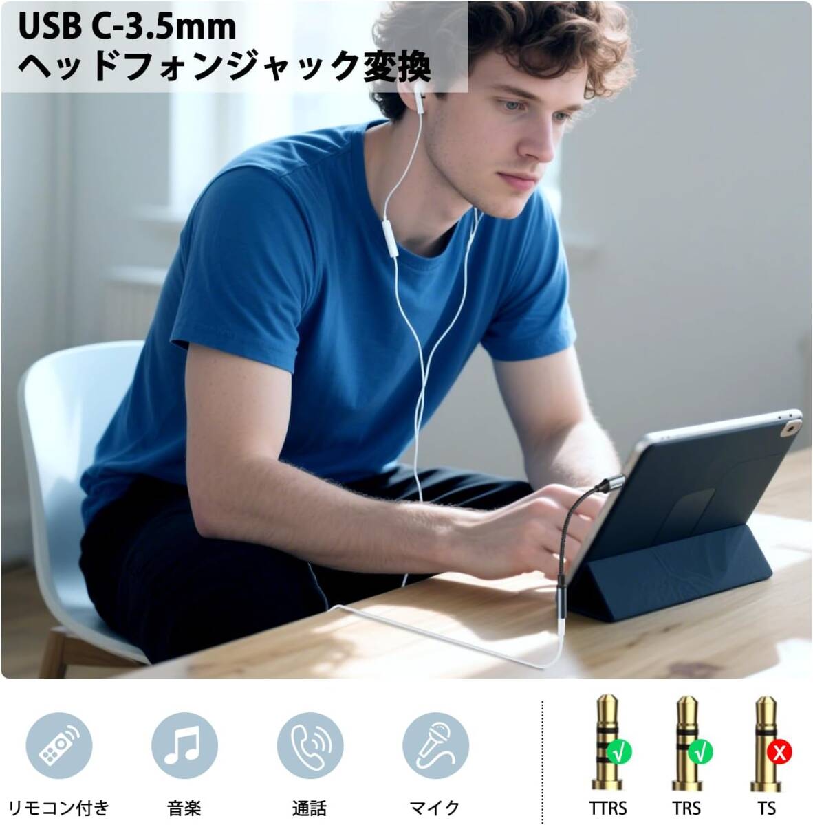 • 【Type-C to 3.5mm変換アダプター・ハイレゾ音質に対応】本製品USB C イヤホンジャック変換アダプターには音声の損失を抑える高品質音声DACチップを採用。最大16Bit /48KHzの高音質出力を提供して音声のロスを最小限に抑えながら、高音質で音楽を楽しめます。USB Type-Cポートから3.5mm3極/4極プラグへ変換できるオーディオ変換アダプター。お使いのUSB-C機器から幅広いヘッドホンやイヤホンから、クリアで繊細なサウンドをお楽しみいただけます。