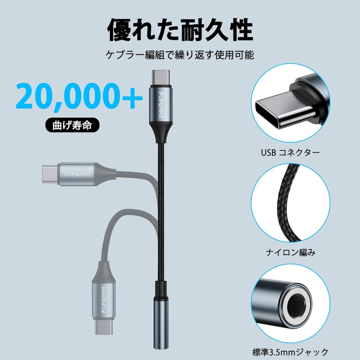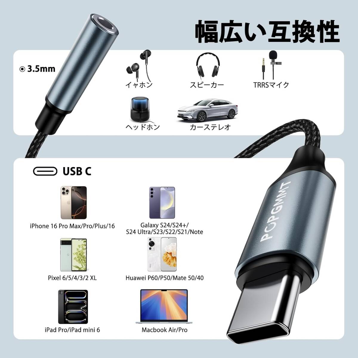 • 【幅広い互換性】このオーディオ 変換 USB C 3.5mm はType Cポートがを備えるデバイスに対応できます。POPGMMT USB C-3.5mm イヤホン変換アダプター は、iPhone 16/15 Pro Max、iPad Pro/MacBook/Glaxy/Huawei/Google Pixel/OnePlusやPS4/PS5などに適用。MAC OS、IOS、Androidのシステムに対応で、幅広い互換性が持ちます。■3.5mm(3極または4極)ステレオミニプラグ搭載機器: イヤホン / ヘッドホン / ヘッドセット(X-BOX等USB-Cポートからの音声出力に対応しない機種では、本製品を利用できませんのでご注意ください。)*注:Apple EarPodsヘッドフォンの3.5mmプラグのマイク機能はサポートされていません。