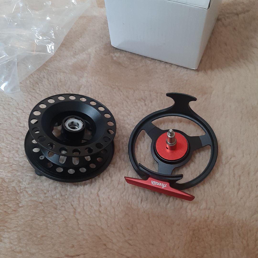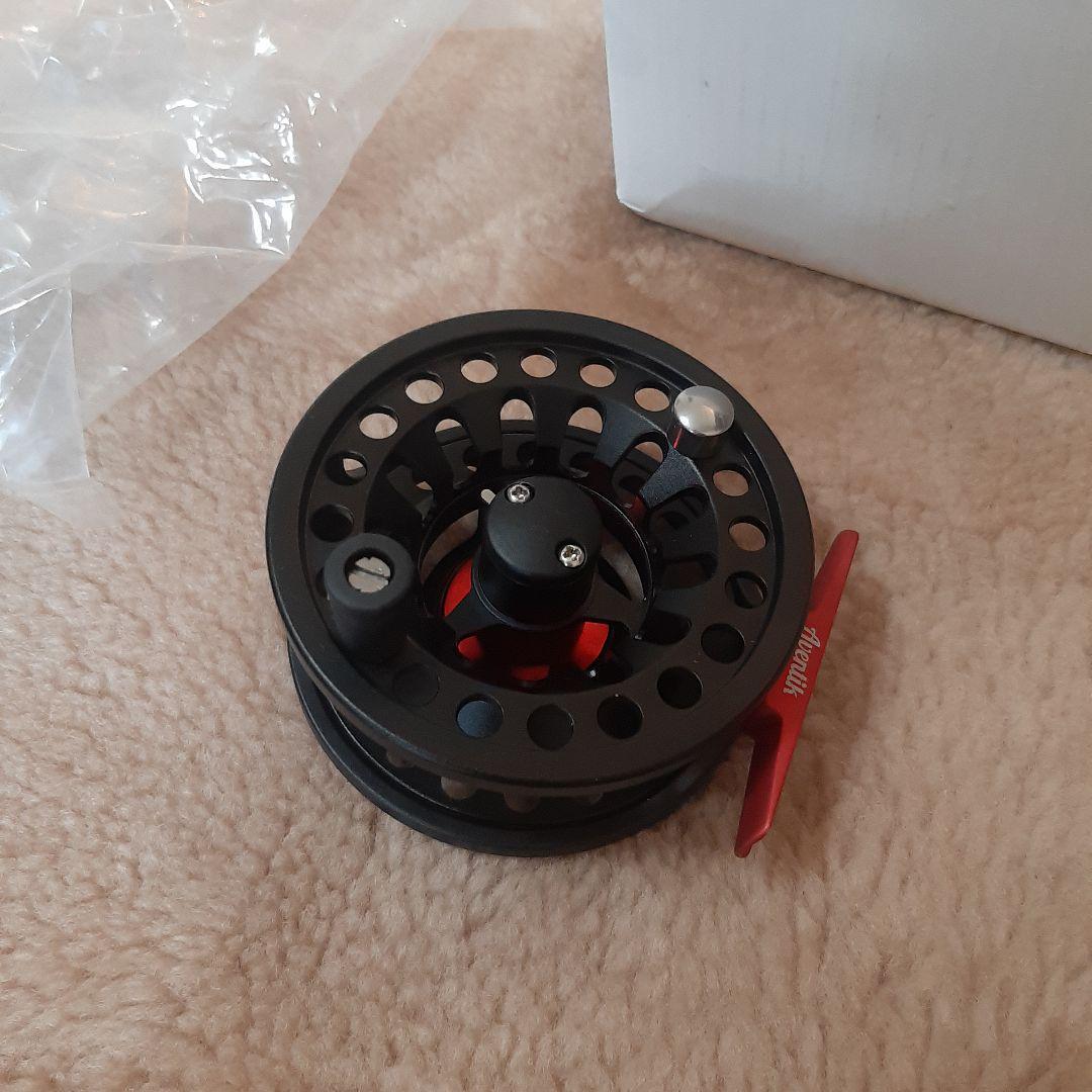 ★新品未使用のフライリール、中型5/7番サイズ、CNCマシンカット切削り製。黒/赤