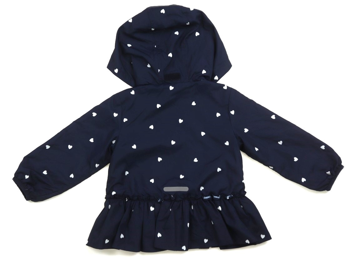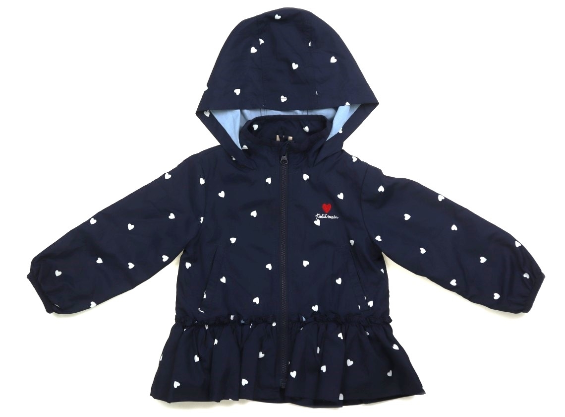 ウィンドブレーカー。ポリエステル地。メッシュ生地の裏地がついています。フードは衿の中にしまえます。胸元中央に黒ずみがありますが、まだお使いいただけそうです。
