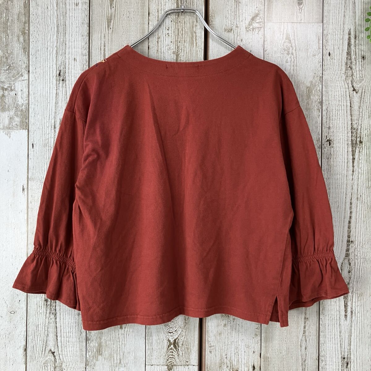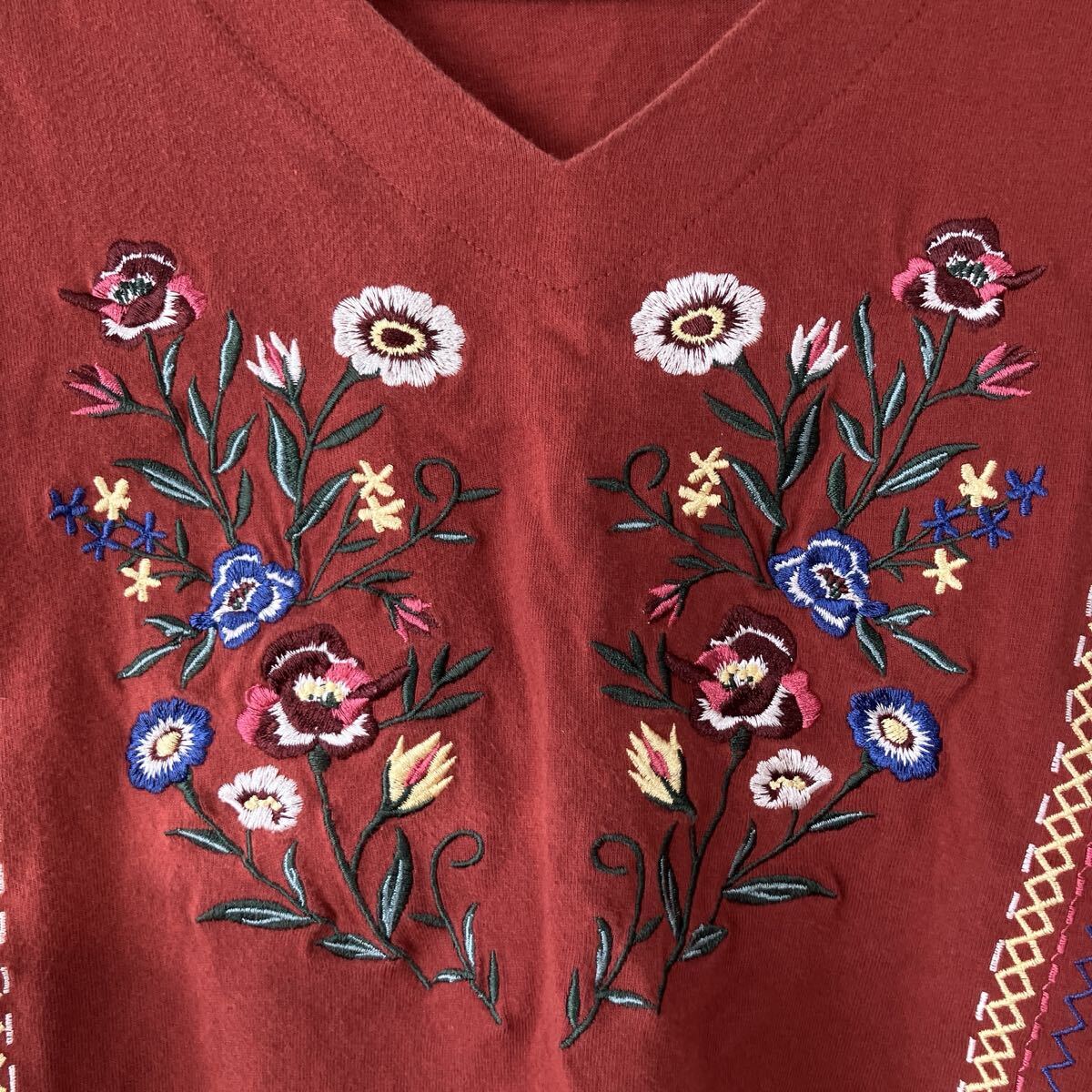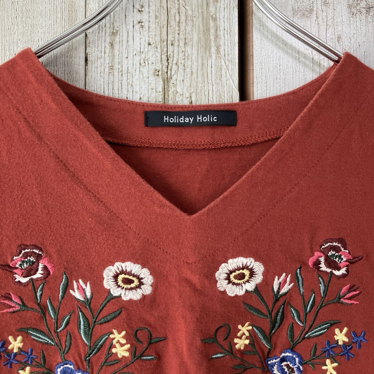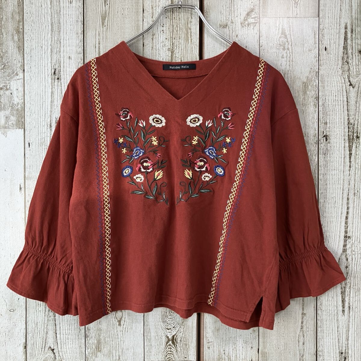 [訳あり]☆Holiday Holic ホリデーホリック☆カットソー ブラウス 花柄 刺繍 フレアスリーブ M スリット Vネック レッド レディース g5835