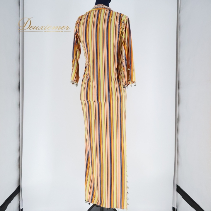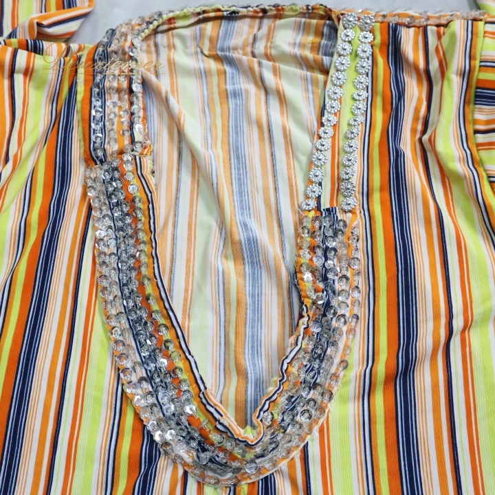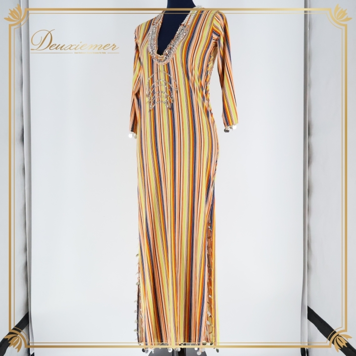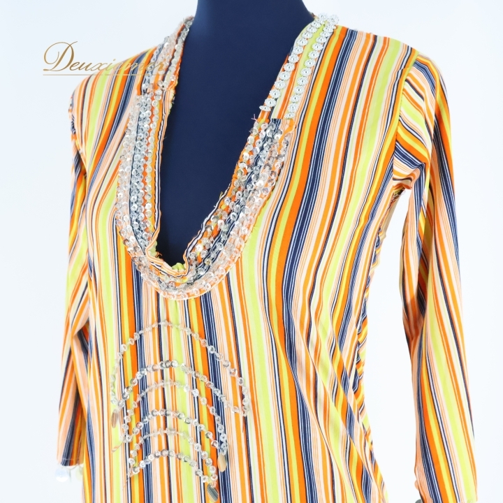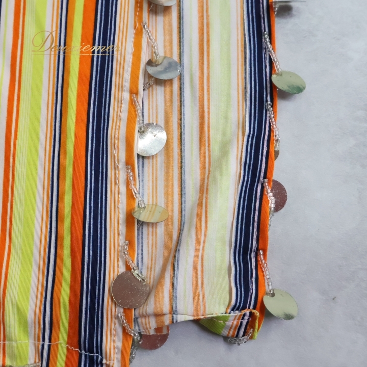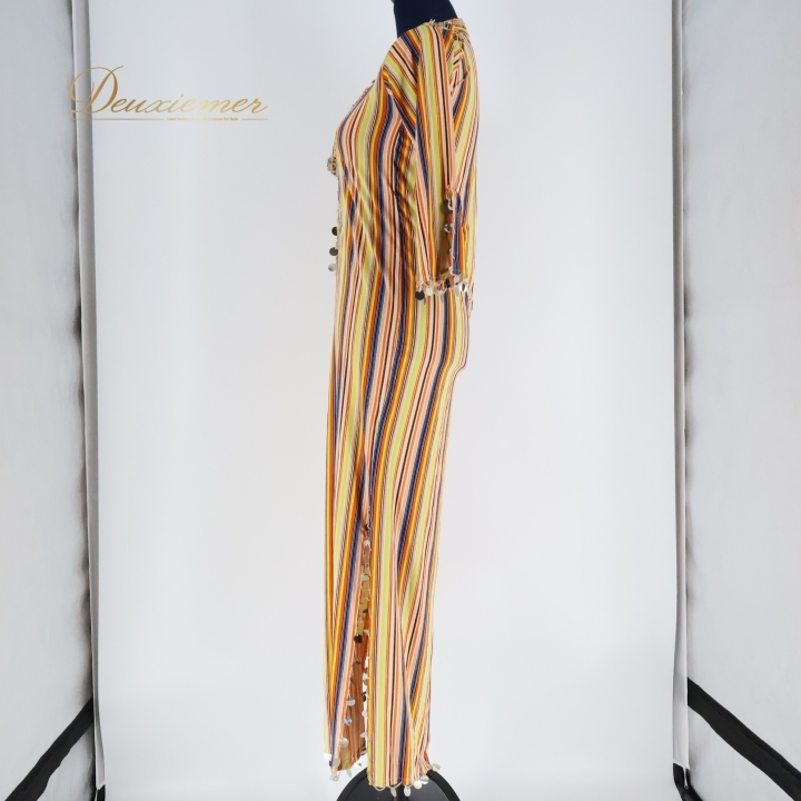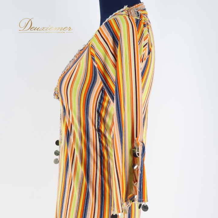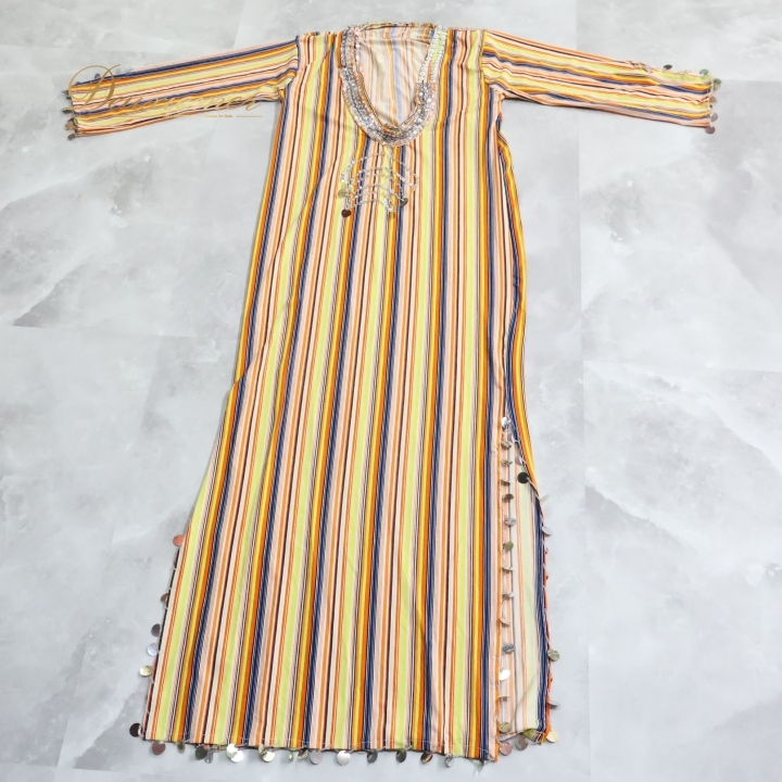 | 【商品名】ベリーダンス衣装 サイーディドレス ワンピースドレス 【サイズ】 平置き実測:総丈約127cm(裾~肩部まで)、肩幅約34cm、 身幅約38cm、ウエスト約41cm、スリット約46cm ※実測の為、多少の誤差はご了承ください 【仕様】 ・伸縮性有り ・肩パッド無し ・胸パッド無し ------------------------------------ 【ポイント】 ▽カラフルな色合い ▽ストライプ柄がオシャレ ------------------------------------ 【撮影時使用トルソー】 種 類:女性用トルソー9号 (一般的に使用されるサイズです) サイズ:肩幅約37cm、バスト約88cm、ウエスト約66cm、ヒップ約89cm |