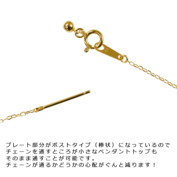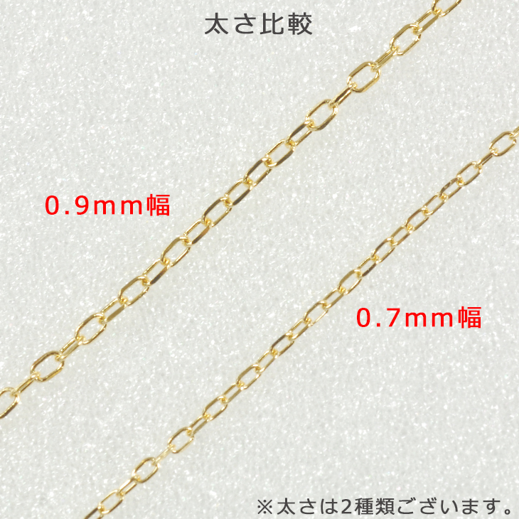 サイズ | チェーン: 長さ 45 cm 幅 約 0.9 mm ポスト:※ペンダントトップを通す方です。 長さ 約 10 mm 幅 約 0.5 mm 重量 約 1.3 g前後 ※重量は多少前後致しますが、ご了承ください。 |