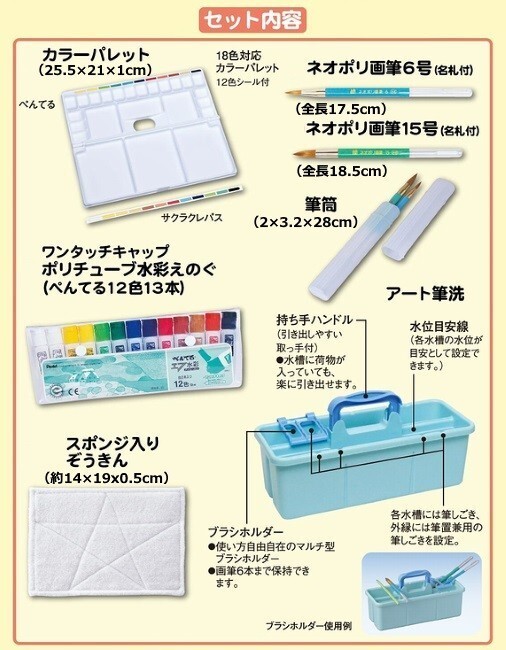 <内容品> ◇ワンタッチキャップポリチューブ水彩えのぐ(12色13本白2本)◇カラーパレット(25.5×21×1cm):ペンてる12色用シール貼付済、サクラクレパス用シール付属 ◇ネオポリ画筆6号(全長17.5cm)・15号(全長18.5cm) 各1 ◇筆筒(2×3.2×28cm) ◇スポンジ入りぞうきん ◇アート筆洗(30×12×10cm):ブラシホルダー付 ◇バッグサイズ:約縦13.5×幅13.5×横32(cm)