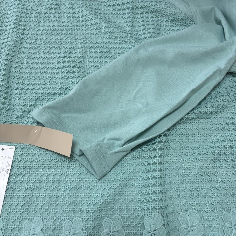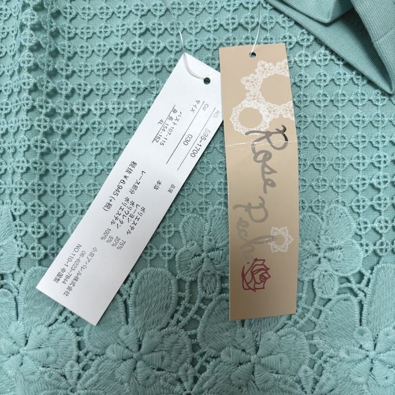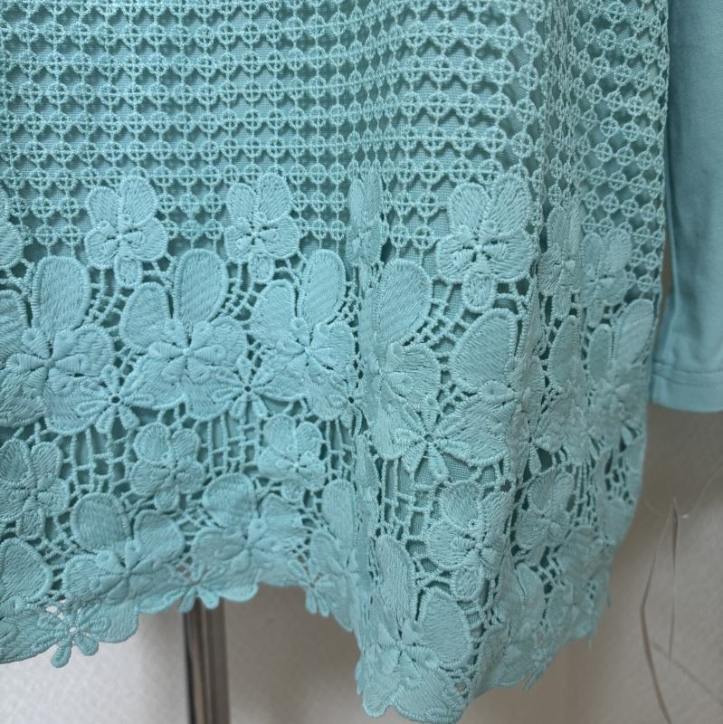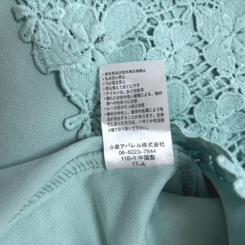 鮮やかなエメラルドグリーンが目を引き、前身頃にあしらわれたレースが上品さを添えます。