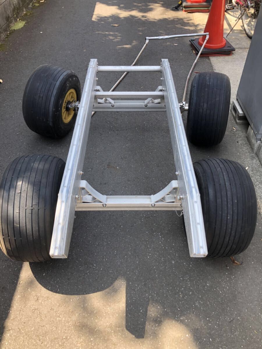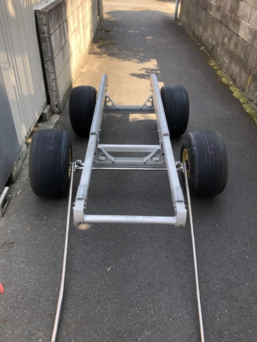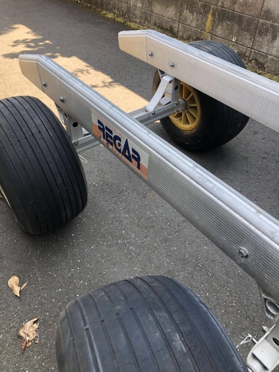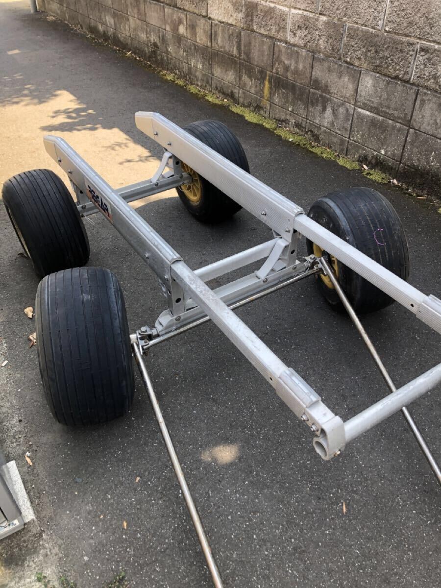 リガーマリン製の4輪ジェットランチャーになります。今では希少な舵が効くタイプになり運搬が楽でした。タイヤはチューブを入れてありますので漏れはありません。ハンドル接続のピンがありませんのでボルトナット等で代用して下さい。その他見落とし等あるかもですのでご理解頂ける方でよろしくお願いします。基本引き取りを希望します。