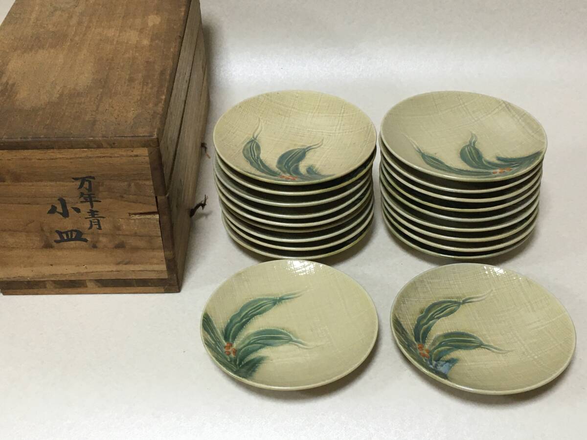 | * 商品説明 * 保管品です。状態良好です。 20枚中5枚は裏底の陶印が見当たりません。 木箱は破損していて、状態悪いです。箱の底が抜けそうなので、持ち運びの際は十分お気をつけください。 サイズ:直径12.8cm サイズにつきましては若干の誤差があるものとお考えください。