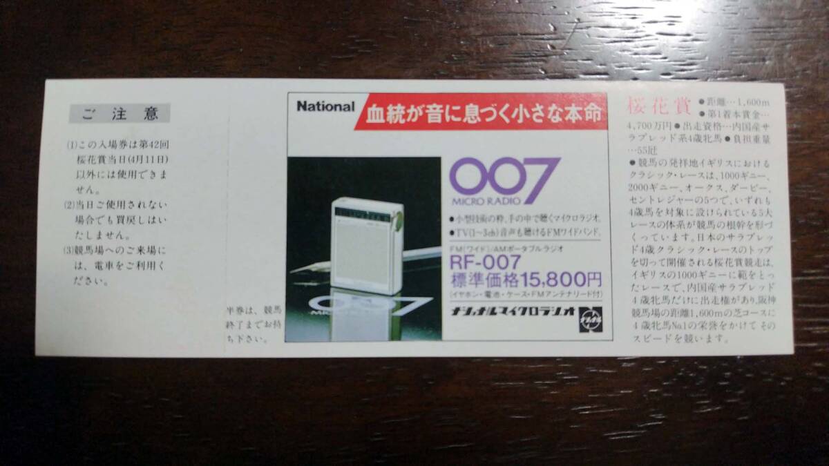 実家に戻って倉庫をあさってたら出てきました。第42回 1981年 桜花賞入場券です。この入場券は、当時私が活動していた競馬サークルに、JRAが好意で終わった発売していないG1レースの入場券をくれました。なので、ナンバリングはされてません。折り目、シワもなくとてもきれいです。ただ見落としなどはご容赦ください。ただしなにせ古いものですので、ノークレーム・ノーリターンでお願いします。また他にも古い入場券を出品しますので、興味がある方は見て頂ければ幸いです。