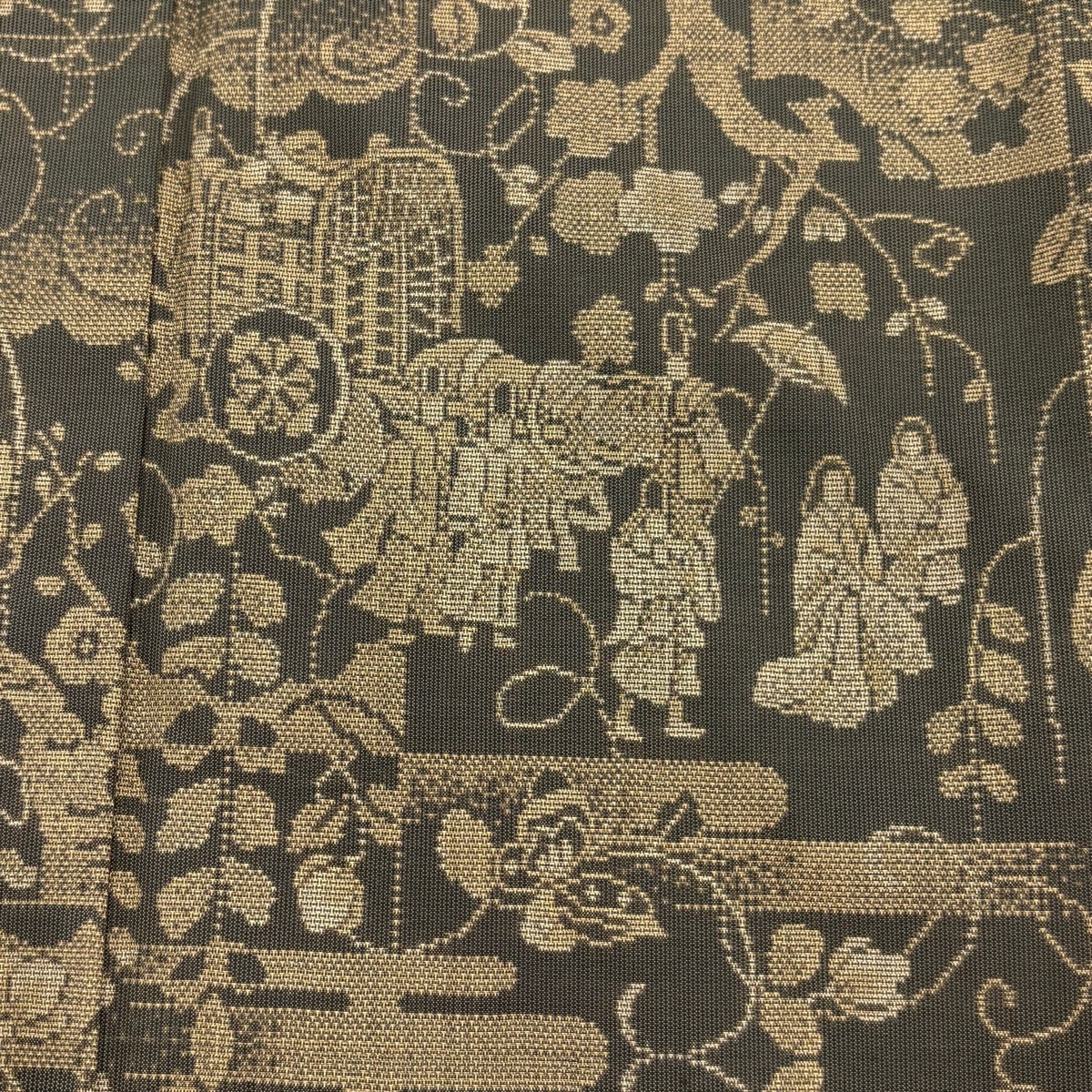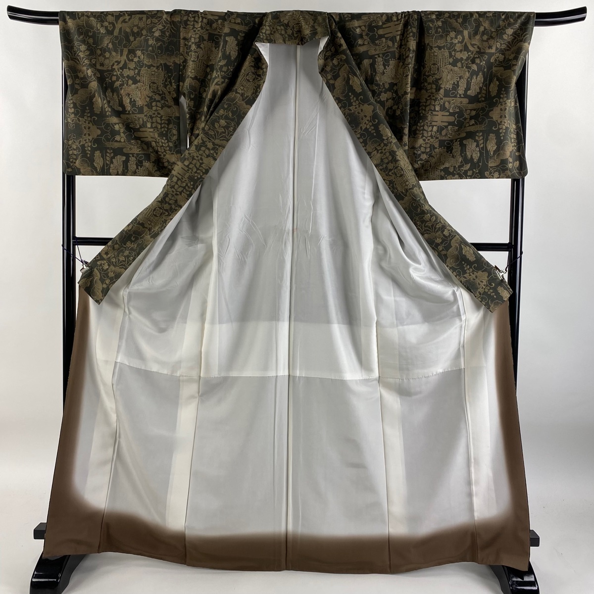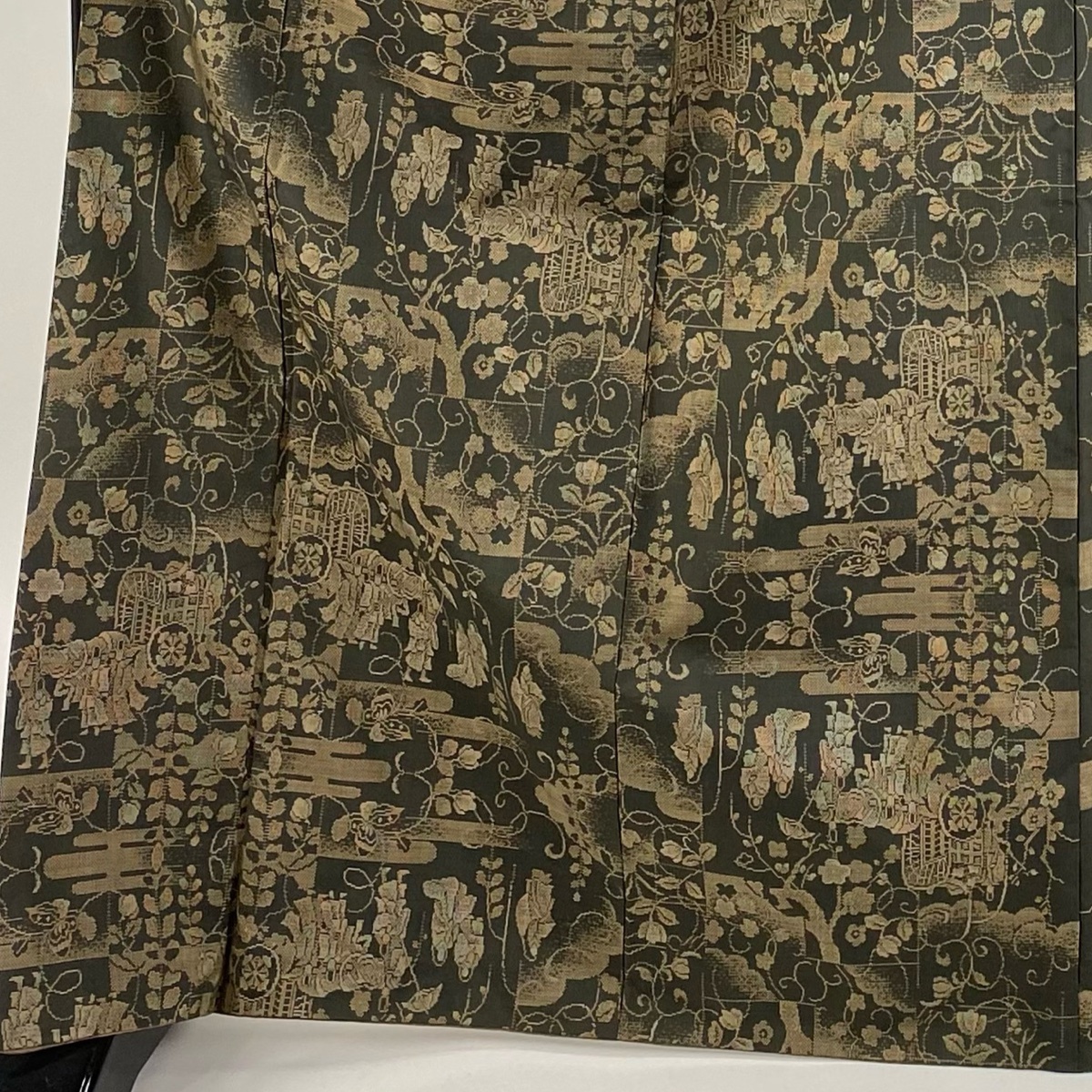 | 紬 秀品 人物 御所車 茶緑色 袷 身丈169 裄丈68.5 L 正絹 【中古】 |