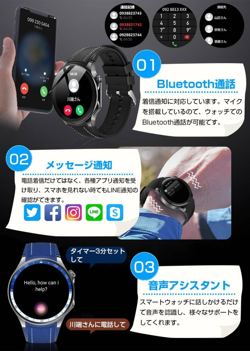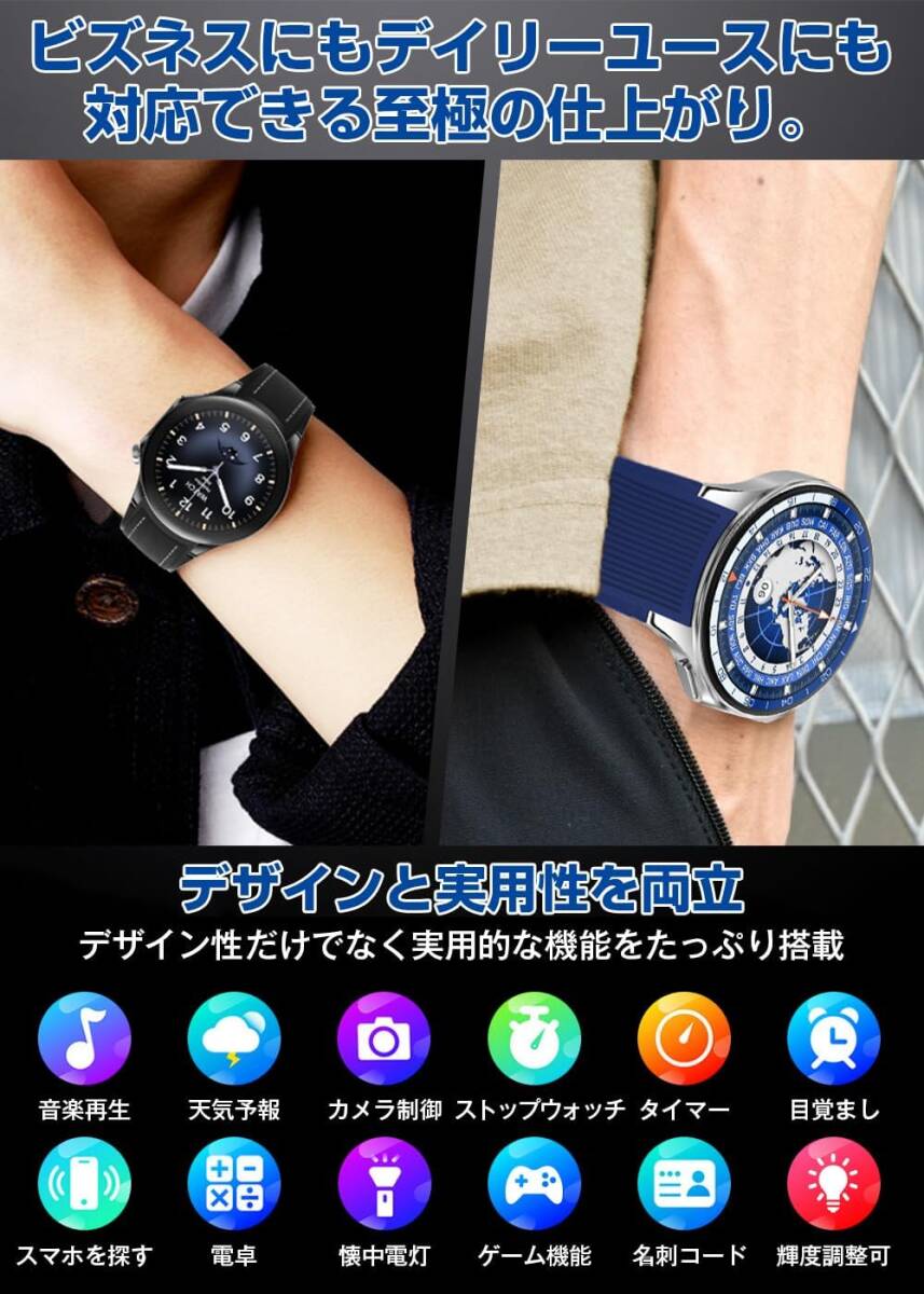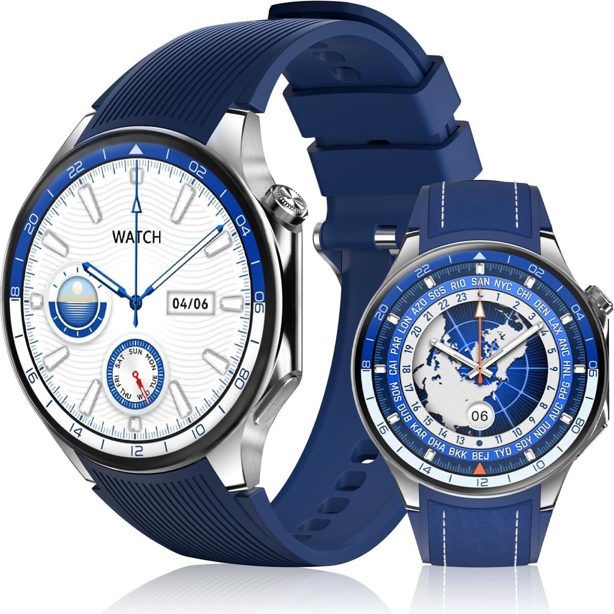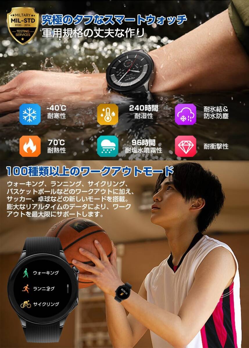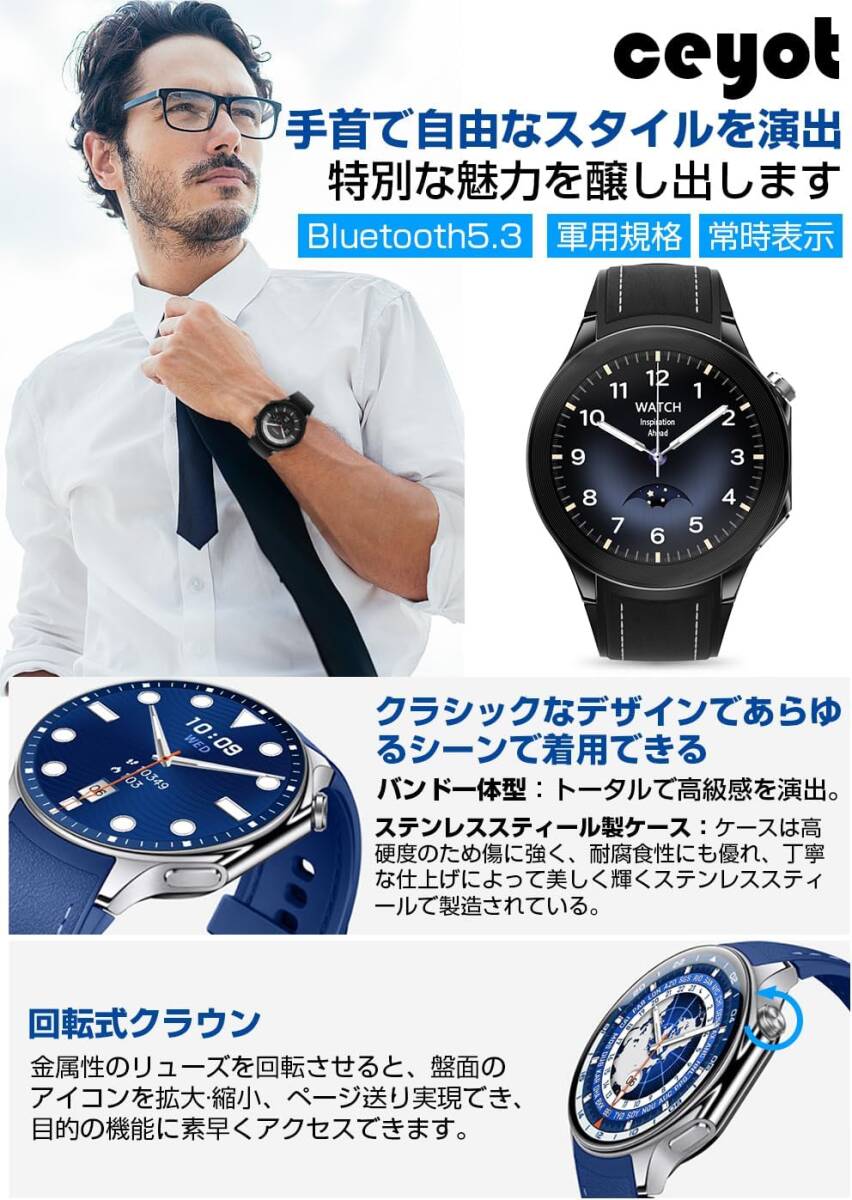 ブルー色 スマートウォッチ 丸型 メンズ 1.43インチAMOLEDディスプレイ 【2種ベルト付き 常時表示 軍用規格 】