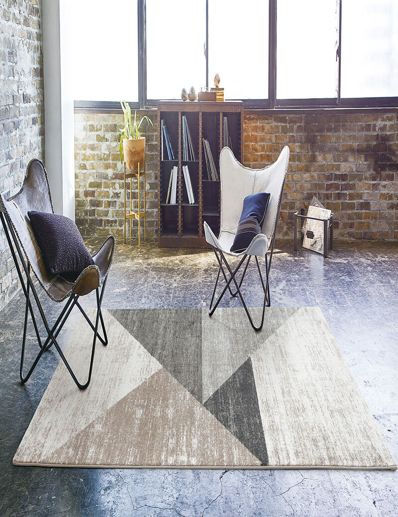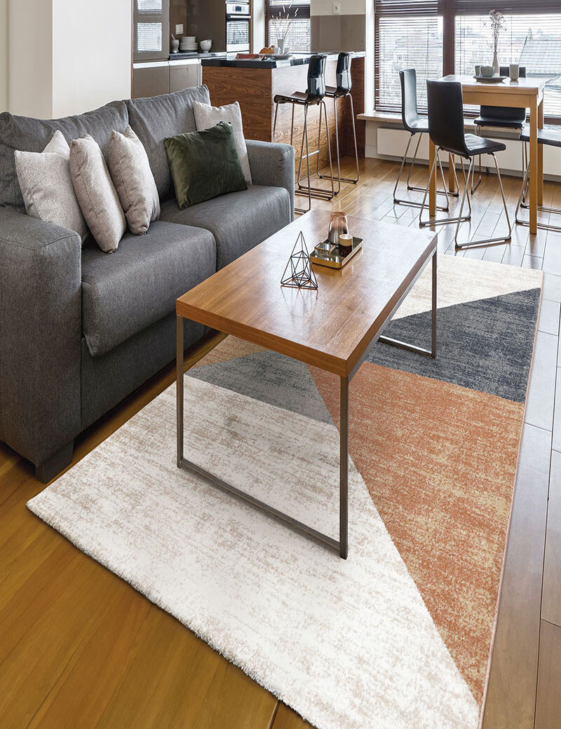 ニュートラルカラーを配したモダンデザインラグ。スモーキーなニュアンスで落ち着いた雰囲気を表現しました。