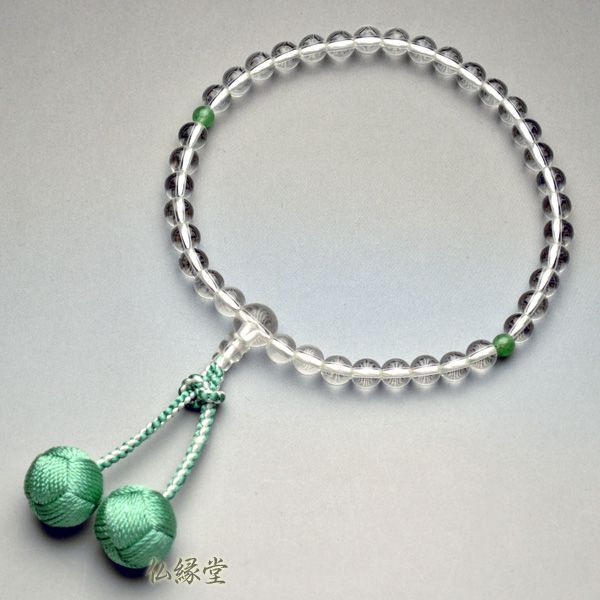 素材 | 親珠:丸珠(10ミリ)本水晶 主珠:丸珠(7ミリ)本水晶 天珠:丸珠(5ミリ)インド翡翠 |