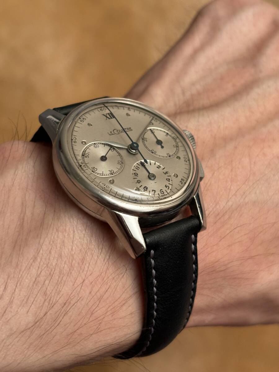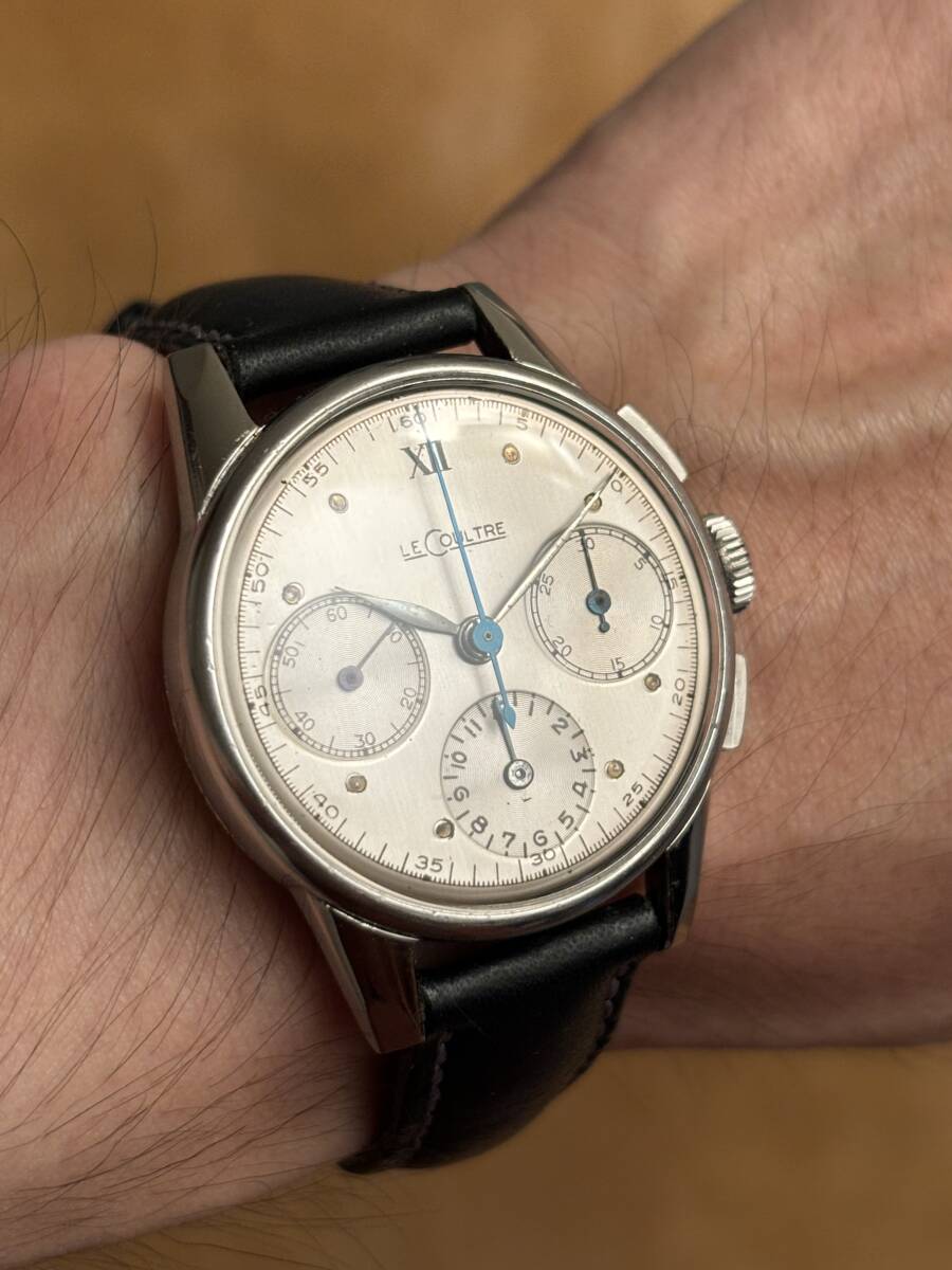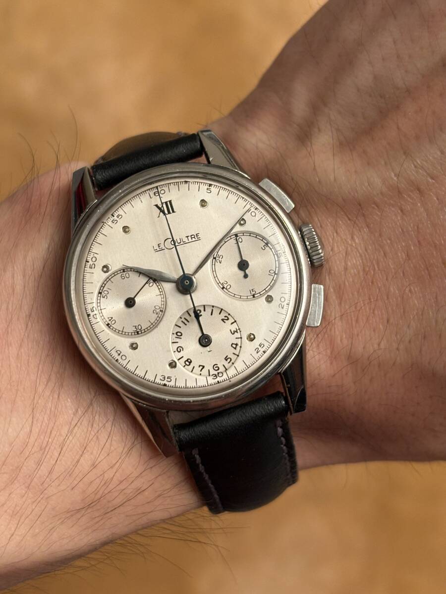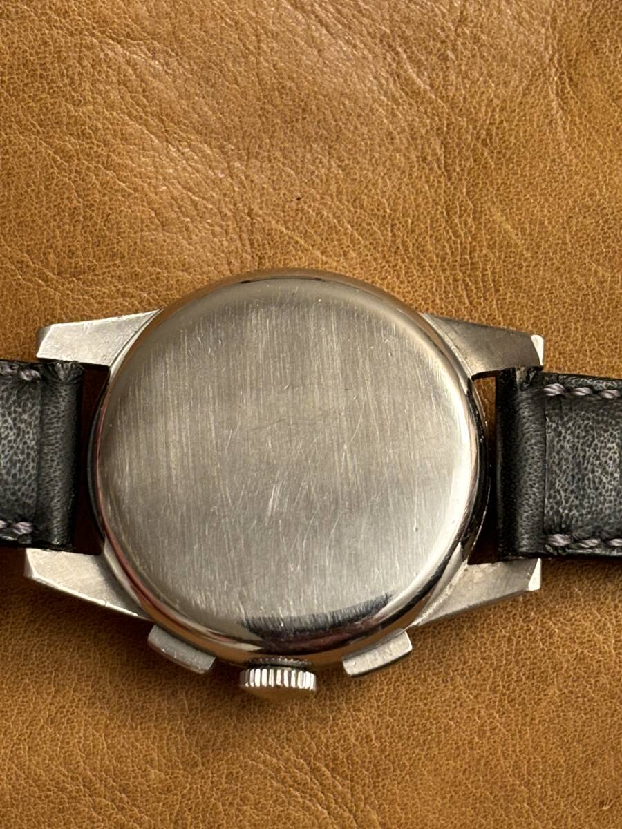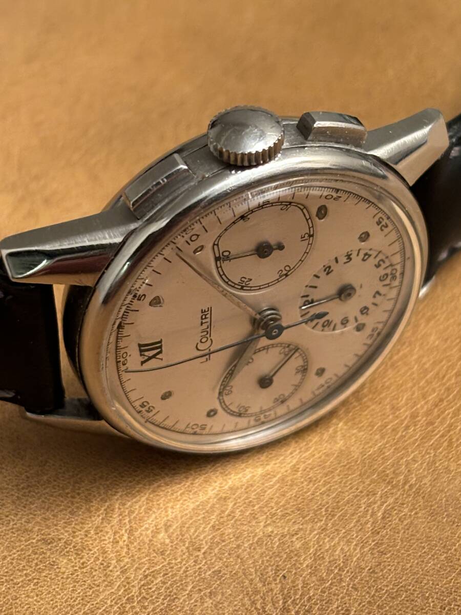ルクルト LECOULTRE銘 1950年代の稀少な3レジスタークロノ シンプルで寂びた雰囲気 春秋冬に ビジネス普段使いOKサイズ感が良く袖にスッと収まります。 もしご希望ございましたら 都内銀座周辺の防犯性の高いパブリックスペース(お互い安心)で現物ご確認して頂けます。 ムーブの画像はご要望あれば別途お送りいたします。 MARTEL製ムーブ搭載 ユニバーサルジュネーブ285と同ムーブ 裏蓋221145刻印 ルクルト本社でOH可能、アーカイヴが出る個体です。 2店舗で真贋鑑定済 都内で修理・販売を長年経営されている信頼が高い店舗ですので間違いありません。【この個体の伸び代】スイス本社に持ち込み、文字盤の仕様と仕上げを打合せの上で作成一部パーツ交換し完全なOHアーカイヴ付の完璧な個体になれば価値が最大限まで高まります。日本国内のルクルトブティック経由ではない故に文字盤仕上げの打合せができます。ご興味の方はお教えいたしますのでお気軽にご質問欄からどうぞ。すぐにOHせずとも着用しながら頃合いを見て仕上げていくこともおすすめします。下記サイトにこのREFの詳細あり、参照ください。https://www.windvintage.com/lecoultre-224115-chrono https://www.shucktheoyster.com/portfolio/jaeger-vintage-steel-chronograph-224115/ (有名なshuck the oysterさん)4500ユーロ 10年ほど手元にあり約3.5万でOH済 修理明細2019年でした。 OH後は年に10回未満の着用でたまに巻いて楽しんでました。 ゼンマイ交換済 5年前のOHですが使用わずかで、まだまだお使いできそうです。 動作と状態は下記に記載しますが 2025/8時点の状態で、ご購入されて私の手から離れた後の 動作不具合は一切保証できません。 受取りから12時間以内に受取りボタンをお願い致します。 すり替えなどトラブル防止のため、返品はできません。 以上ご同意下さる方のみご購入お願い致します。 到着後のトラブルがあり。。このような文章ご理解下さい。 動作:OH済、現状で日差1分程度で可動 クロノ:上プッシャーでスタート・一時停止可、下プッシャーでリセット可、零帰可能 針動作:全て動作 リューズ操作:手巻き可、時刻合わせ可 パワーリザーブ:約2日未満(おおよそ) 外装 SSケース:バネ棒の取付部分が飛び出るタイプ(オス) 過度な磨き無く状態良い。小傷有。 プラ風防:割れ無し、小傷あるが状態良い 文字盤:12時のみローマン、表面はとても細かい縦サンド仕上げ 荒れや経年若干あるが文字盤全体は良い雰囲気 クロノ窓はきれいなレコード溝有 針:リーフ、若干経年あるが良い雰囲気 ※OH時に再塗装してません。 秒針とクロノ針は青焼き針 全て写真でご判断下さい。 ブレス:柔らかめの濃紺レザーをそのままお付けします。 お使い頂ける状態 お好みで交換ください。 計測(電子ノギス) 横幅34.3mm 縦:42.5mm ラグ幅:16.5mm 厚さ:11.7mm 重さ:40.5g(軽い) 他の経路でお譲り先が決まった場合は終了します。 1分を切って買取金額を下回っている場合は終了前に取り消します。 何かございましたらお気軽にご連絡ください。 気軽にコメントください。 海外代行業者様、お取引歓迎です。 値引交渉がシステム上出来なくなったので、オファーございましたらご質問ください。 ※出品期間中にご質問を確認できない場合があり、 そのまま自動再出品される場合があります。。 お手数ですが再度ご連絡ください。 基本的に無視はしません。 丁寧な梱包をおこない宅急便最小サイズで発送致します。 環境配慮の為、梱包材の再利用があること、ご了承下さい。 ペット飼育なし喫煙なしの環境です。 他にも良品を出品しておりますの是非ご覧ください。 ご質問・金額面での交渉などございましたらお気軽にお問い合わせください。 大幅な値引きはできないものもありますが、 コレクション整理中のため金額が折り合えば検討致します。 ご希望の金額で難しい場合でも、これ以上でしたらお譲りします、 と目安を返答しますので再度ご検討ください。 | ||