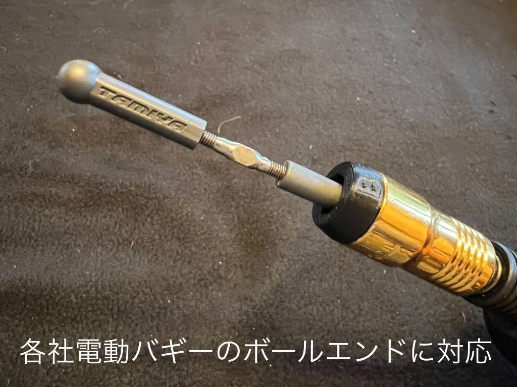タミヤバギー用5mm強化アジャスター(TAMIYA刻印入り)の他、ヨコモ、アソシエイテッド、京商、3レーシング等のバギー用ボールエンドを回す事が出来ます。タミヤのツーリング用等小さめのツーリングカー用等は空回りしますので、ツーリング用タイプTをお使い下さい。