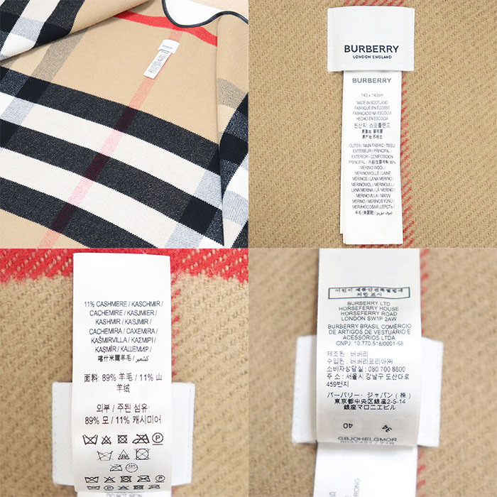 シリーズBURBERRY バーバリー ケープ ノバチェック TB ロゴ モノグラム ダブルフェイス カシミヤ混 レディース 140cm×140cm マルチカラー