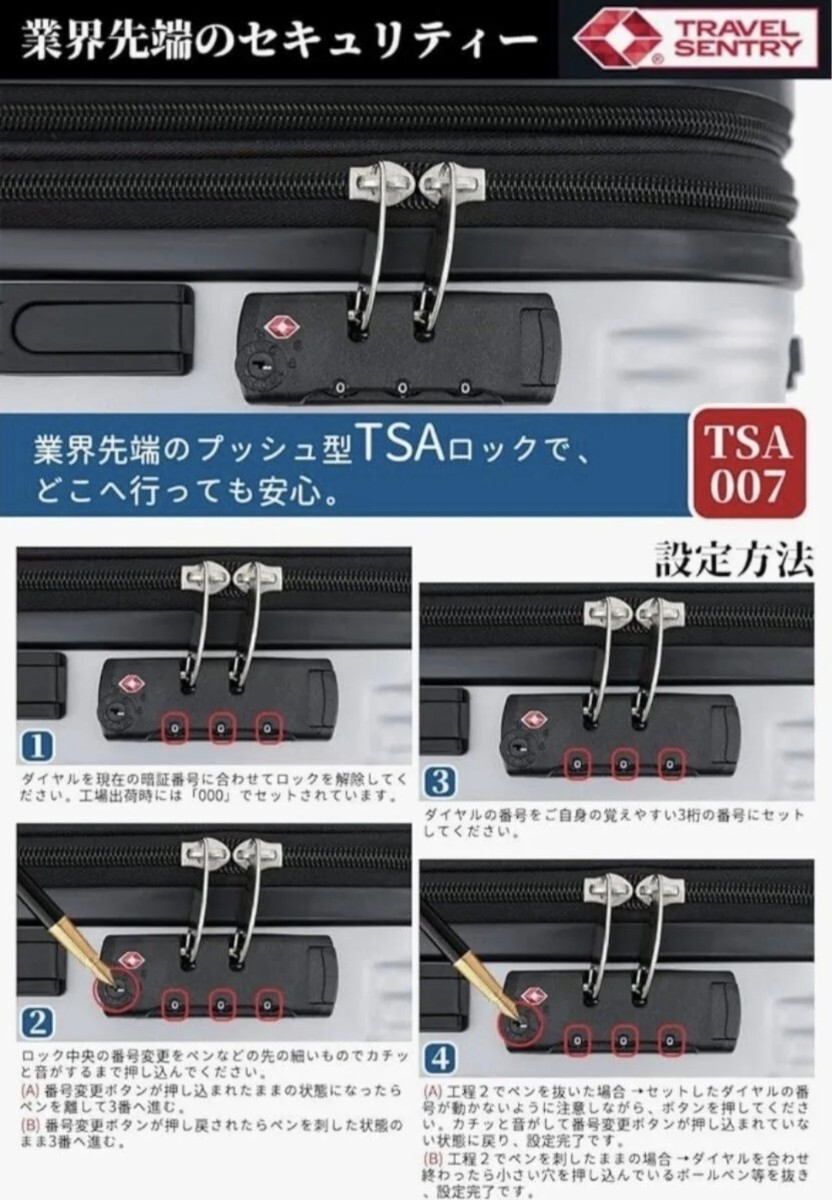TSA認証のダイヤルロック付きで国際線利用時も安心。滑りやすい特殊コーティングで開閉作業が快適です。