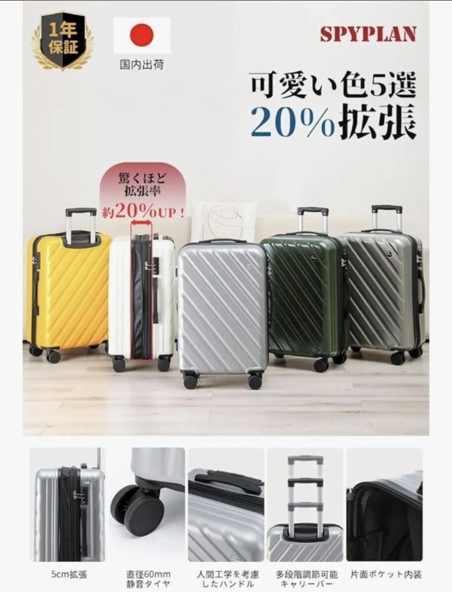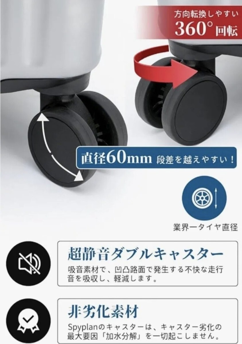 超静音キャスター搭載 従来比70%静音化キャスターを採用。ホテルや深夜空港でも周囲を気にせずスムーズに移動可能。ゴム製ベアリングと防振設計で、凹凸道でも音を立てません。