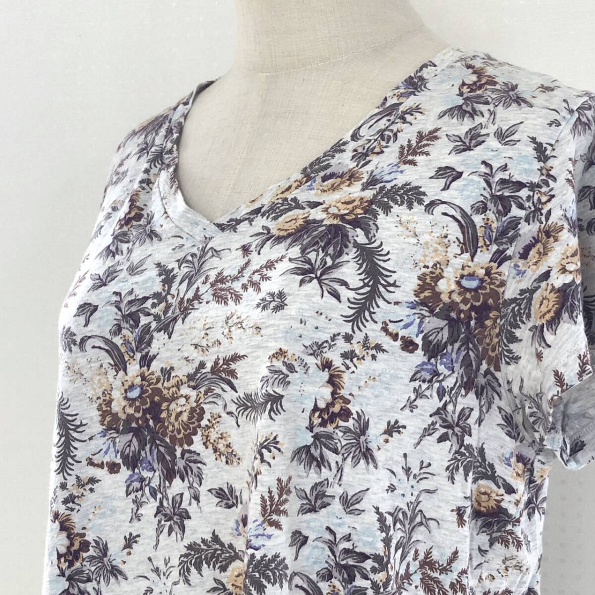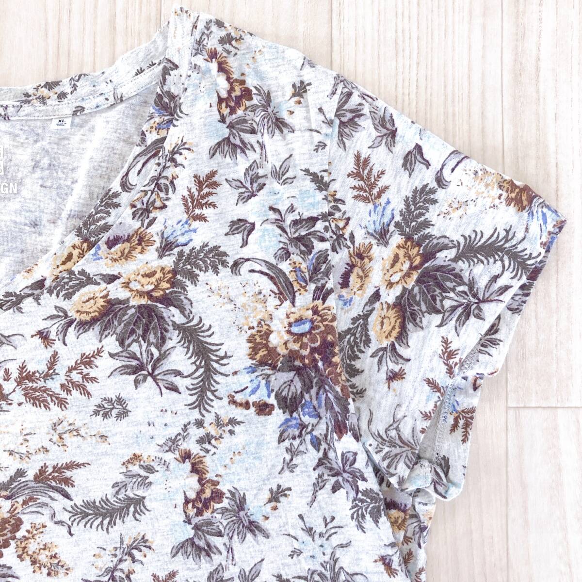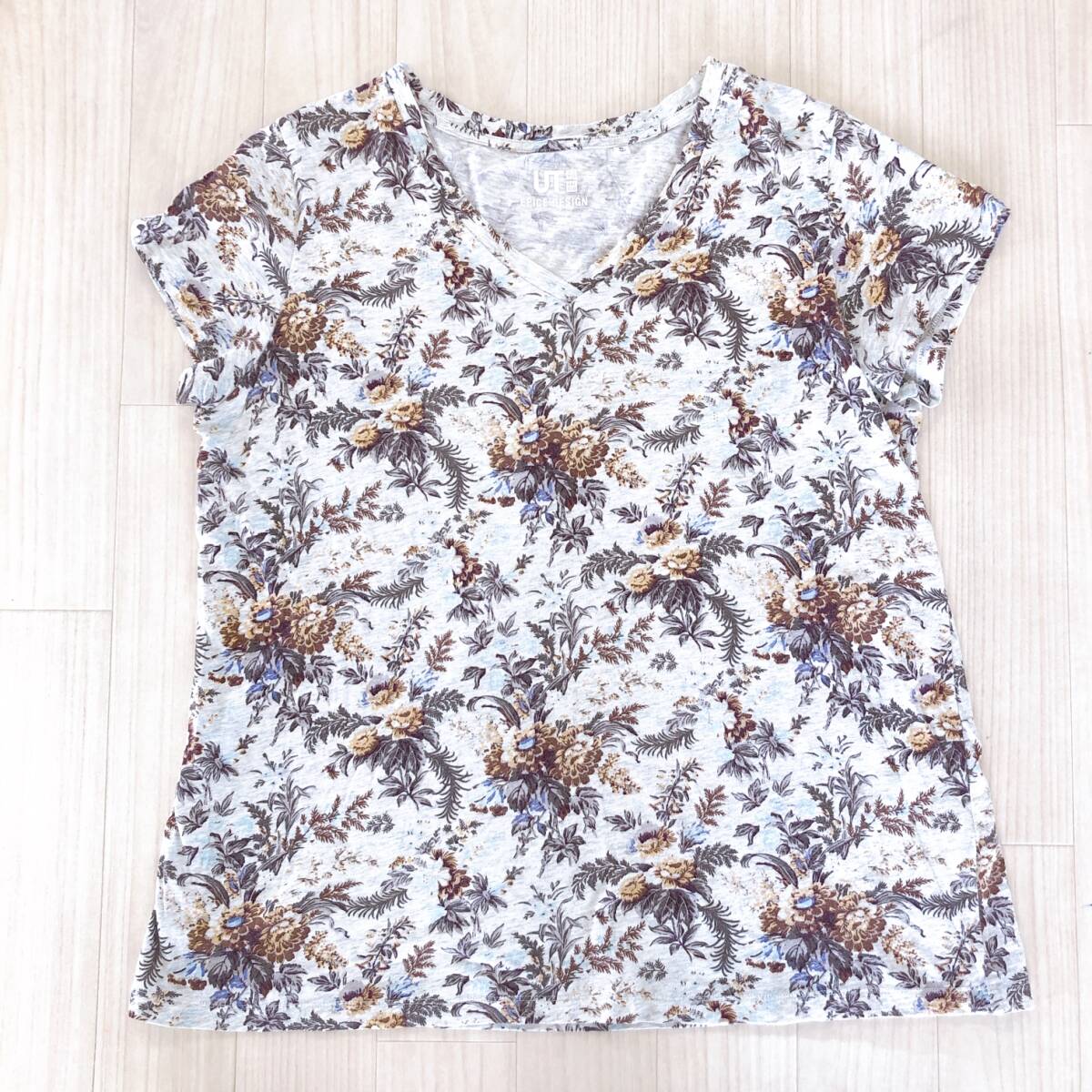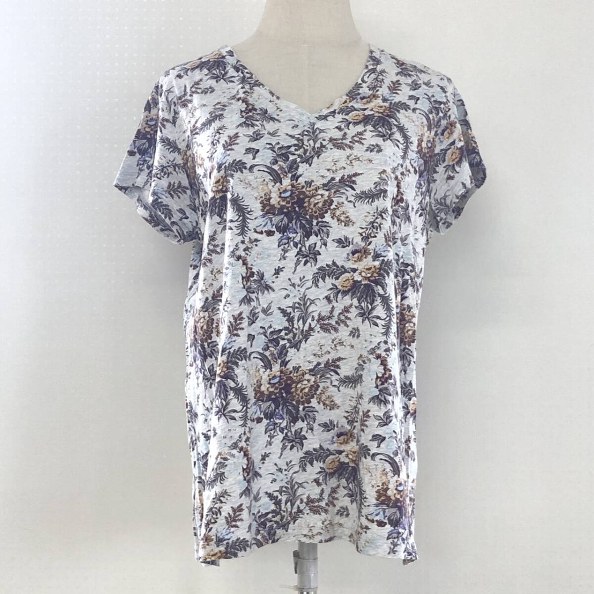 Y1512 UNIQLO ユニクロ レディース トップス Tシャツ 半袖 薄手 Vネック XL グレー 灰 ブラウン 茶 花柄 綿100% 大人カジュアル涼しげ春夏