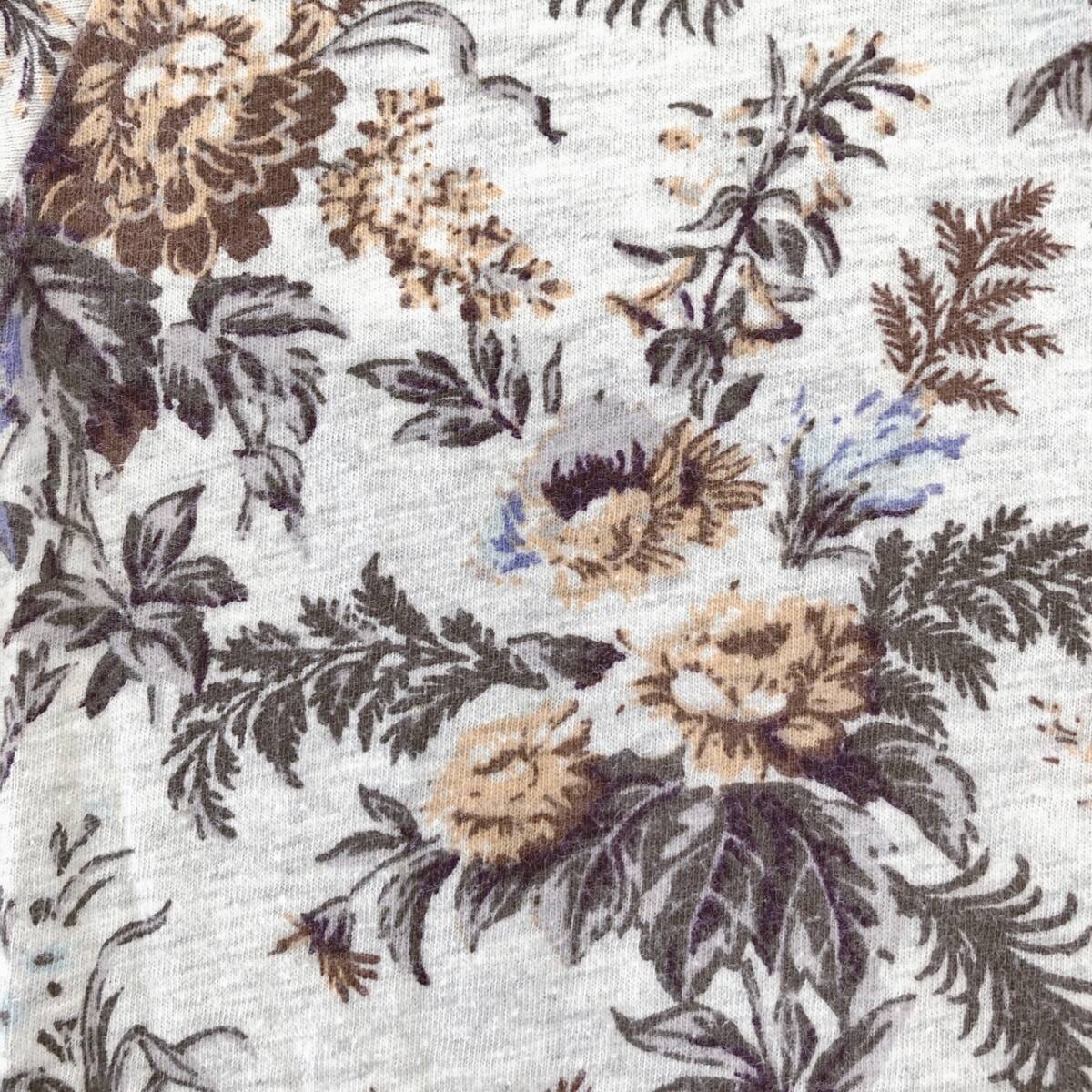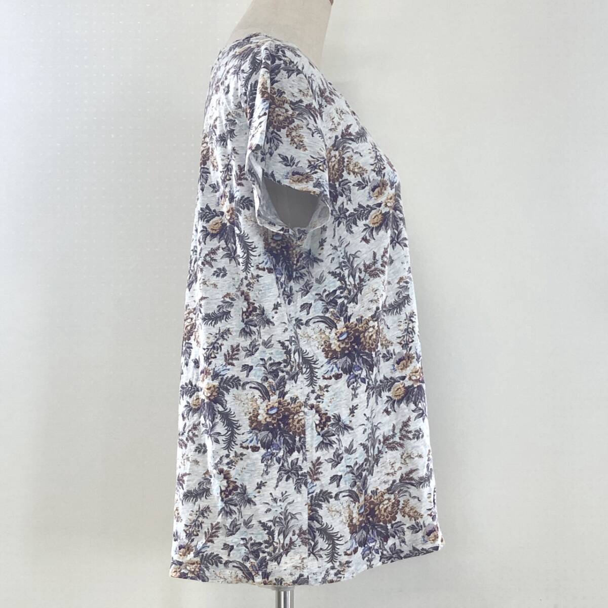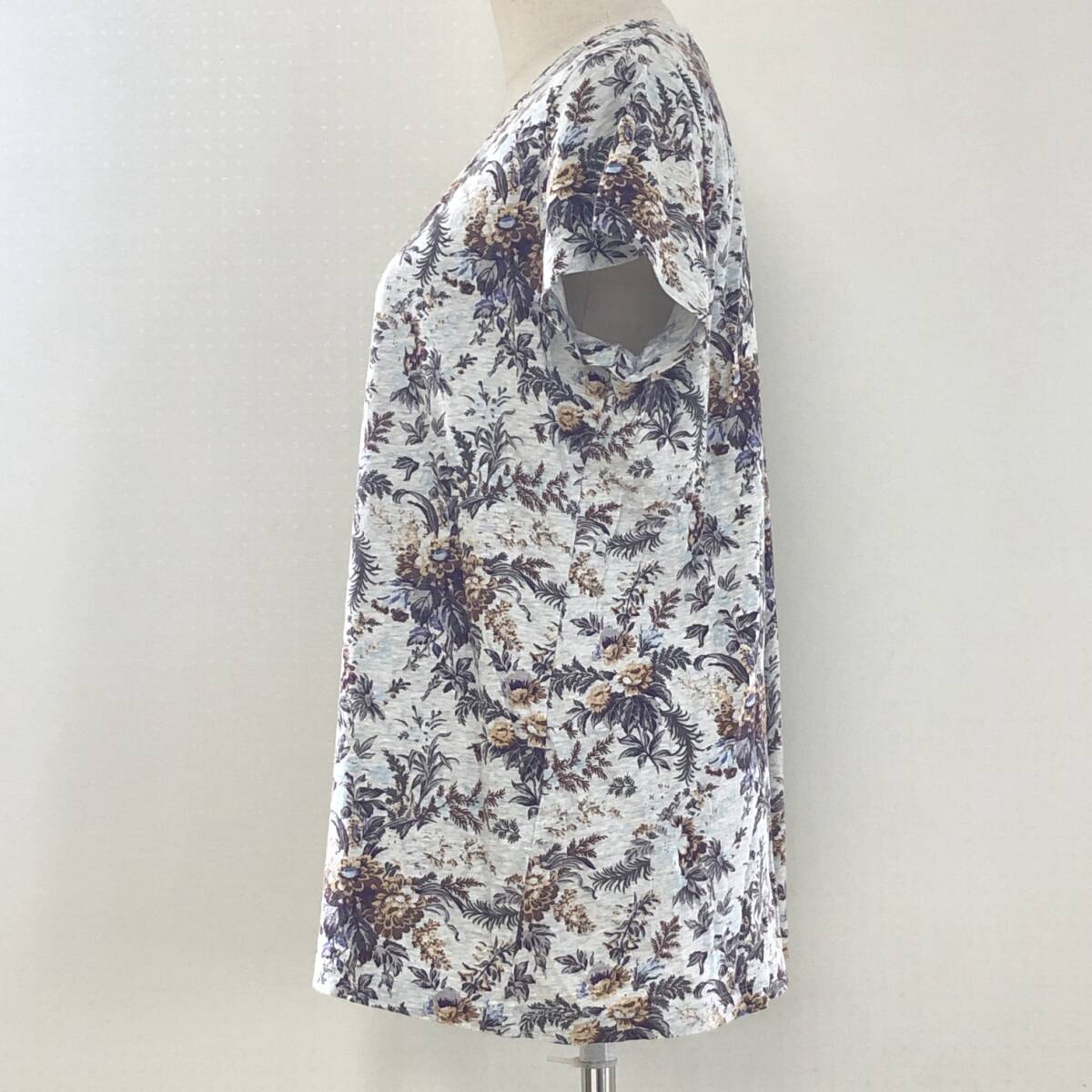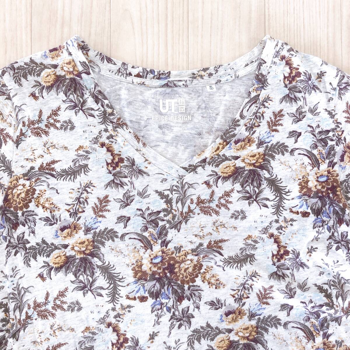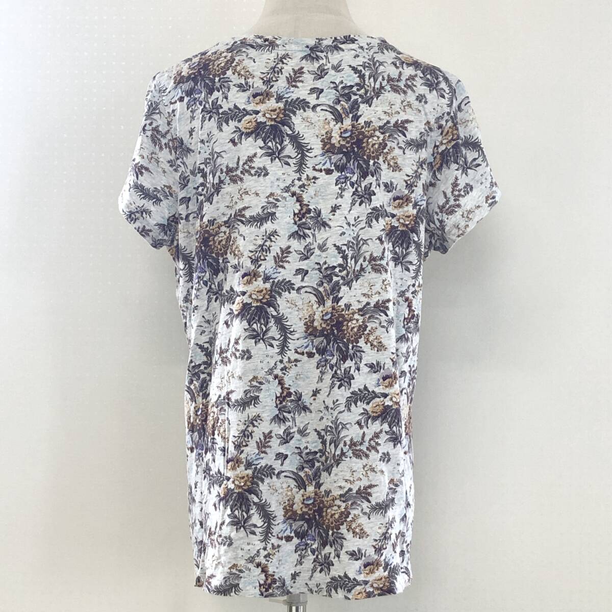 Y1512 UNIQLO ユニクロ レディース トップス Tシャツ 半袖 薄手 Vネック XL グレー 灰 ブラウン 茶 花柄 綿100% 大人カジュアル涼しげ春夏