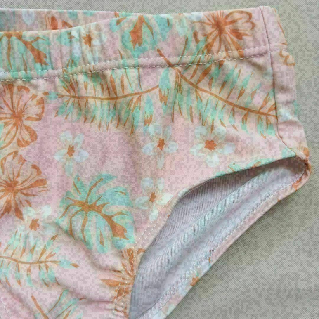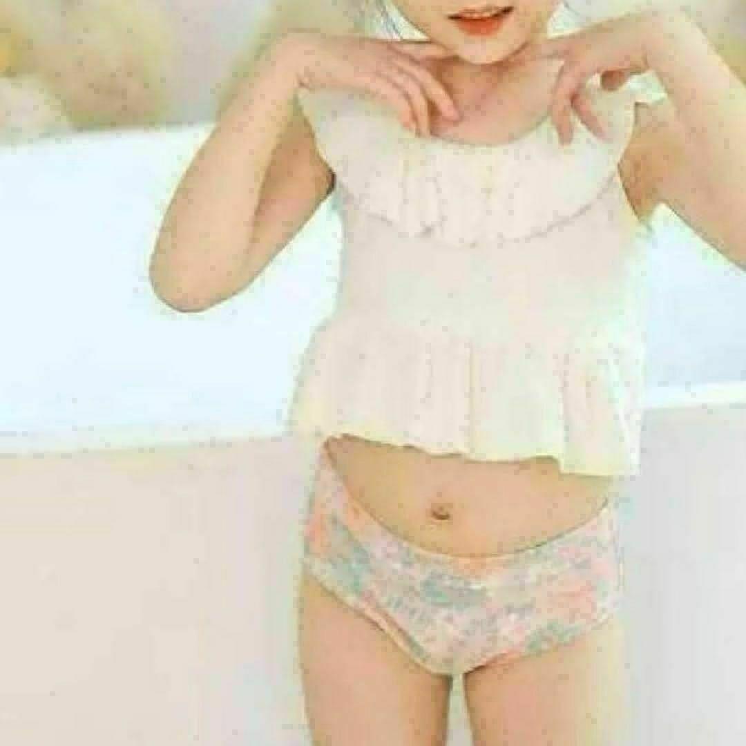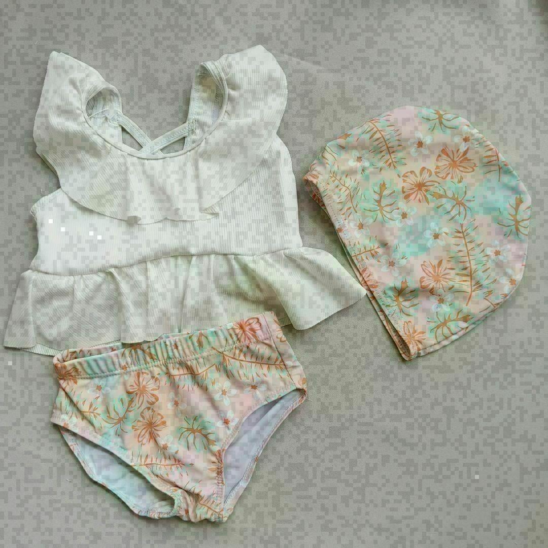 ・キッズ用水着です。トップスはシンプルなホワイトで、どんな場面でも映えるデザイン。ボトムスは可愛らしい花柄で、写真映えも抜群です。セットで同柄のスイムキャップ付き!