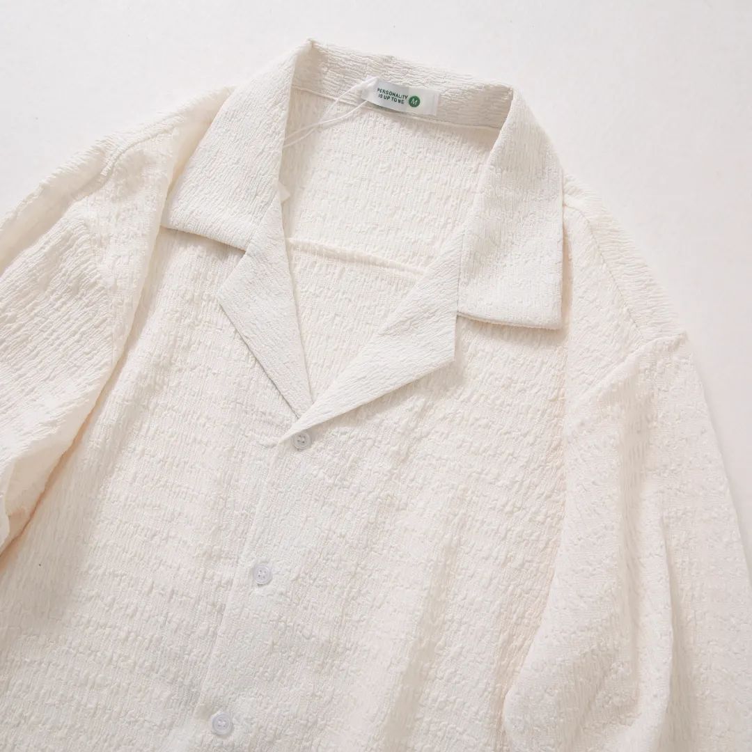 ・オープンカラーで抜け感をプラス:首元がすっきりと開いた開襟デザインで、リラックス感と清涼感を兼ね備えた一着です。