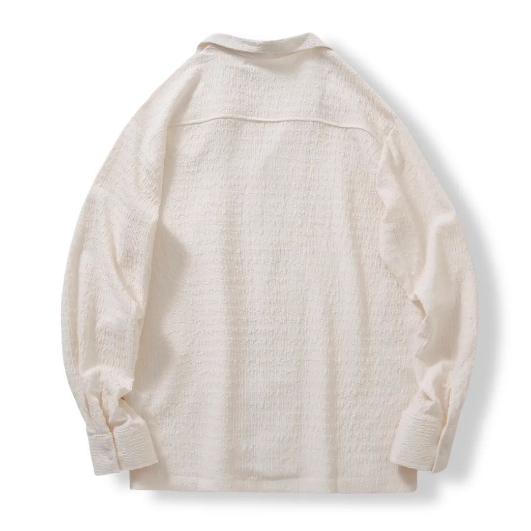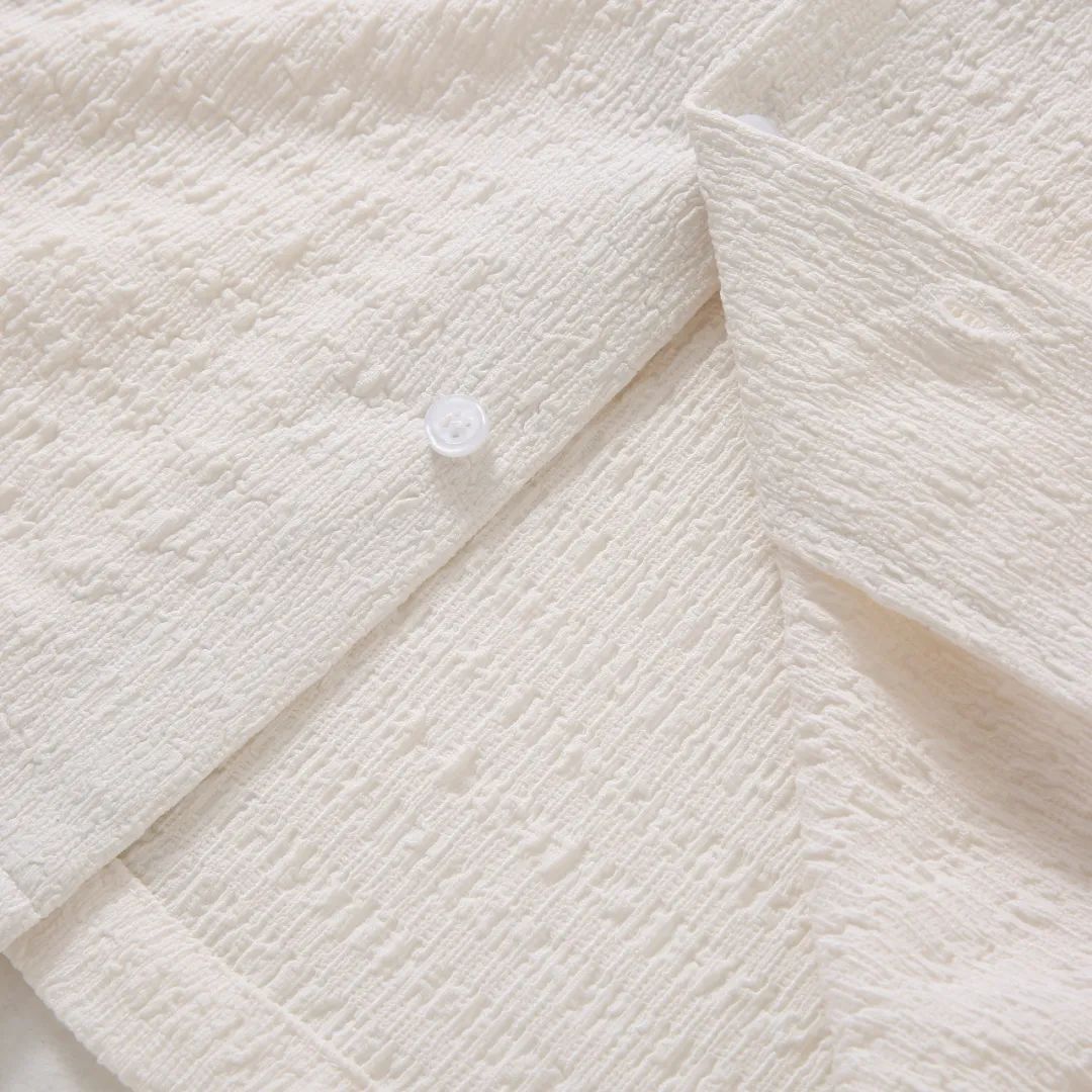 ・シアサッカー生地で通気性抜群:凹凸感のあるシアサッカー生地を使用し、肌離れが良く、汗ばむ季節でもさらっと快適な着心地を実現。