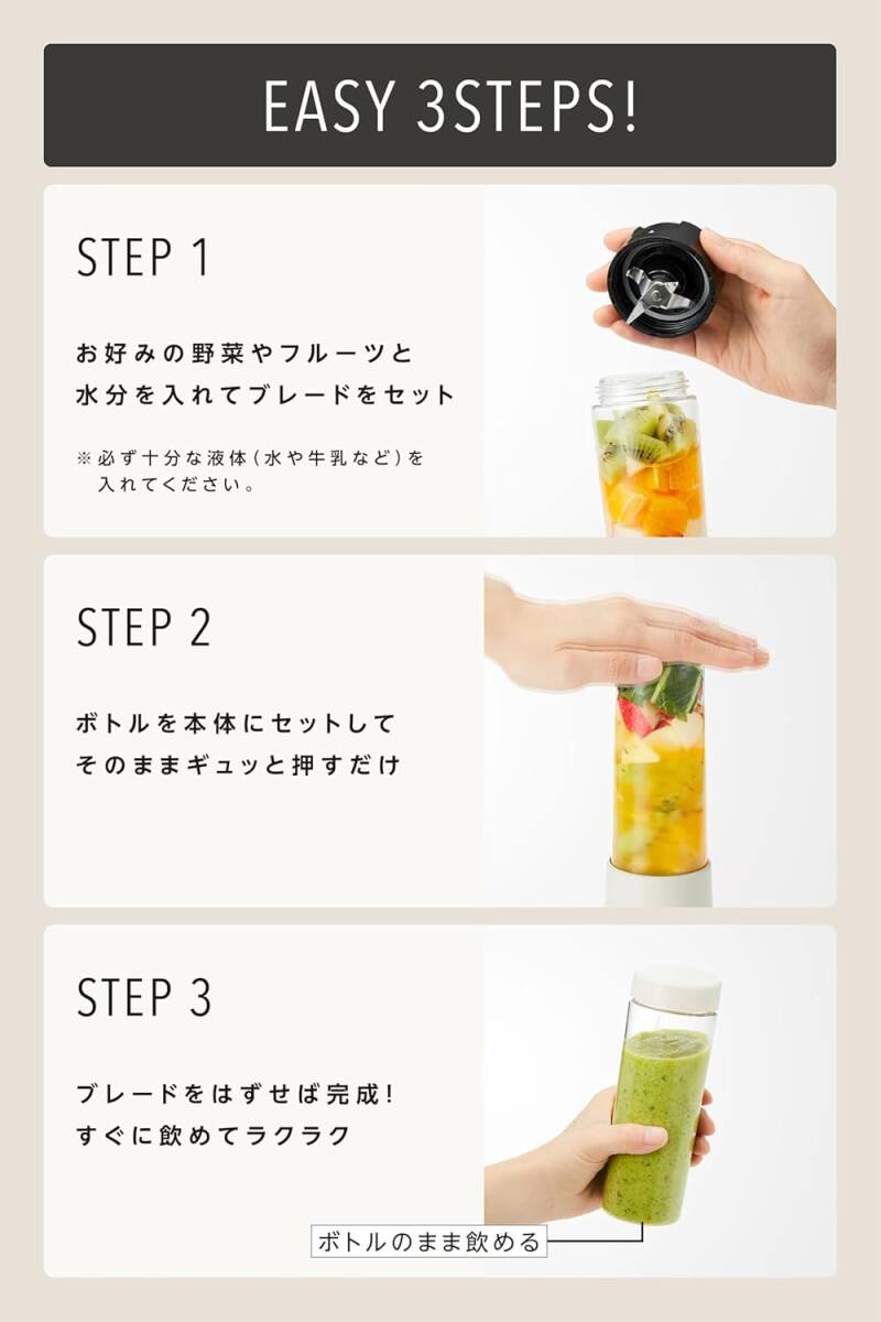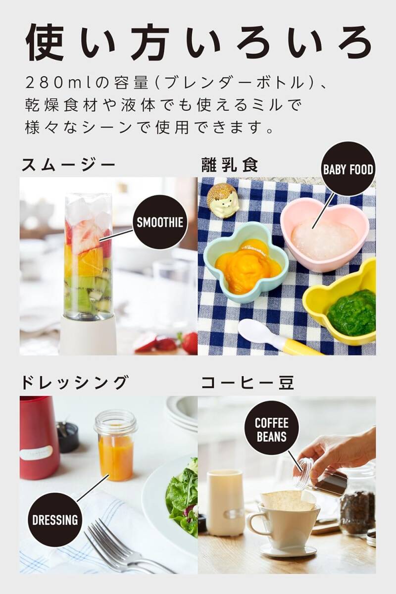 | 商品説明 | 【簡単にスムージーが作れる】 【280mlの飲みきりサイズ】 飲みきりサイズで、スリムなフォルム。 直径約7.6cmのコンパクトサイズの スムージーミキサーなので狭いキッチンにも置きやすく、 収納しやすいのが特徴。 【氷の使用OK】 パワフルモーターで、氷も砕けて冷たいスムージーも作れます。 ボトルは軽く、扱いやすい樹脂製ボトルを使用しているので、 洗うのも片づけも簡単で持ち運びにも便利です。 カラー:チェリー(赤系) サイズ:280ml 発送方法:宅急便 |