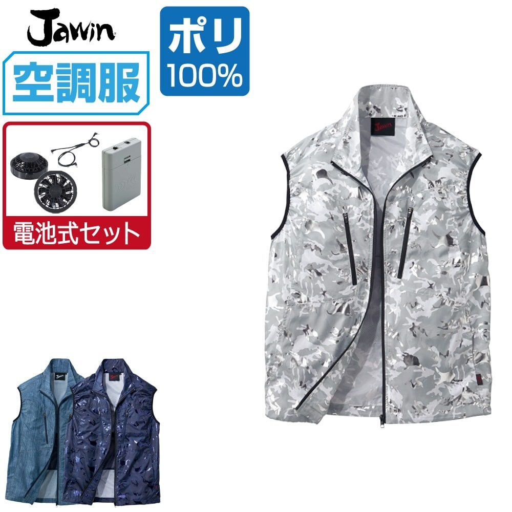 空調服 セット 【電池式セット】 Jawin ジャウィン ベスト ポリ100% 54060 色:インデイゴ サイズ:EL(3L) ファン色:グレー