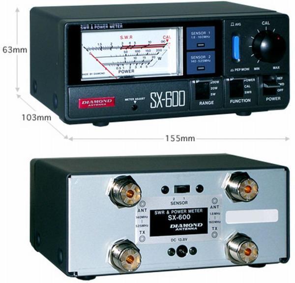 | SX600 通過形SWR・パワー計 第一電波 【1.8~525MHz・2センサー内蔵】 ●外形寸法:W155×H63×D103mm ●重量:630g ●周波数範囲:S1(1.8~160MHz)、S2(140~525MHz) ●電力測定レンジ:5W・20W・200W ●電力測定確度:±10%(F.S) ●連続測定最大電力: 150W S2(140~220MHz)、100W S1(1.8~100MHz)/ S2(400~525MHz)、70W S1(100~160MHz) ●SWR測定最小電力:S1(1W)、S2(4W) ●挿入損失:S1(0.2dB以下)、S2(0.3dB以下) ●測定機能:進行波電力・反射波電力・SWR・PEPモニター ●入力コネクター:M-J ●照明表示:外部DC13.8Vセンサー電源接続時照明、センサー切替LED表示 ●電源:13.8V ●センサー:2センサー方式(S1/S2) | |||